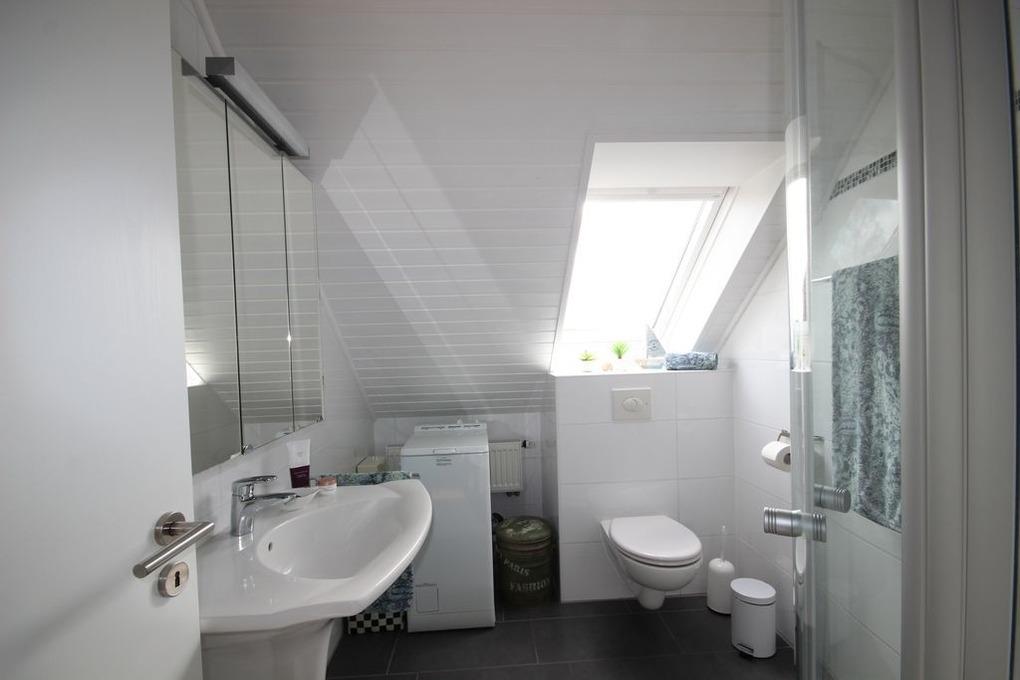 Helles Tageslicht-Duschbad mit Waschbecken, WC & Waschmaschine.