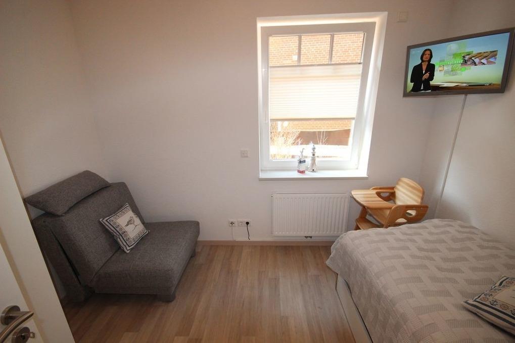 Im 2. Schlafzimmer befindet sich ein Einzelbett, Schlafsessel, Kleiderschrank & TV.
