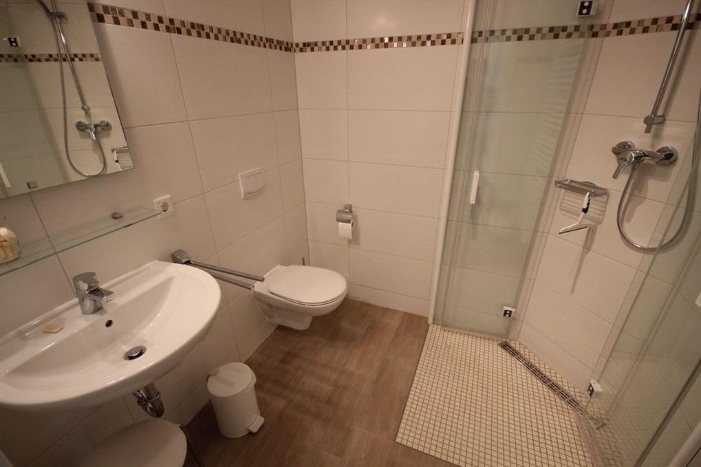 Das Bad hat eine ebenerdige, gehbehinderten geeigneten Dusche, Waschbecken & WC.