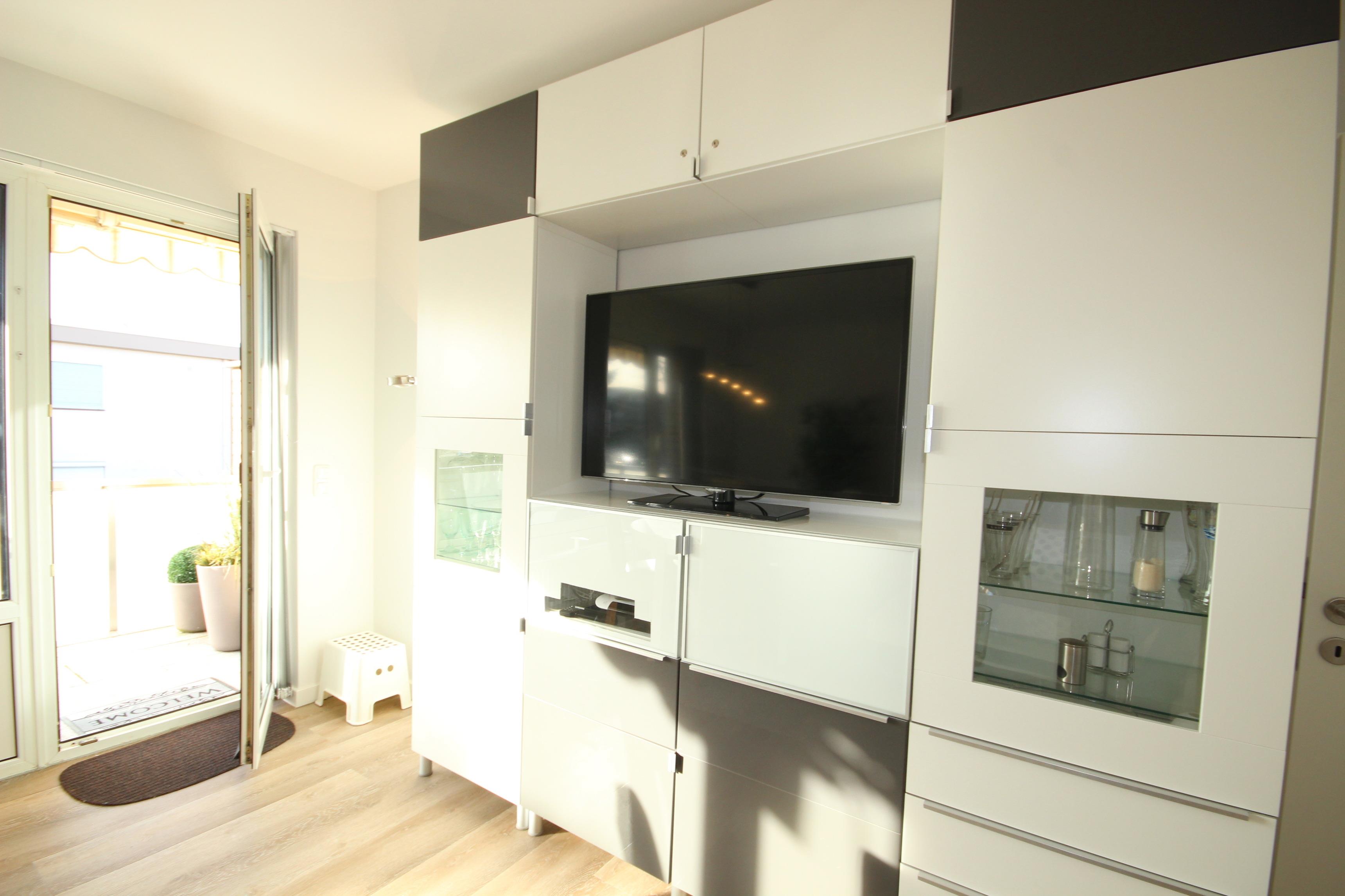 Das geschmackvolle, helle Wohnzimmer verfügt über eine bequeme Couch-Garnitur, Flachbild-TV, DVD- Player Essplatz und hat Zugang zum sonnigen, möblierten Süd-West-Balkon.