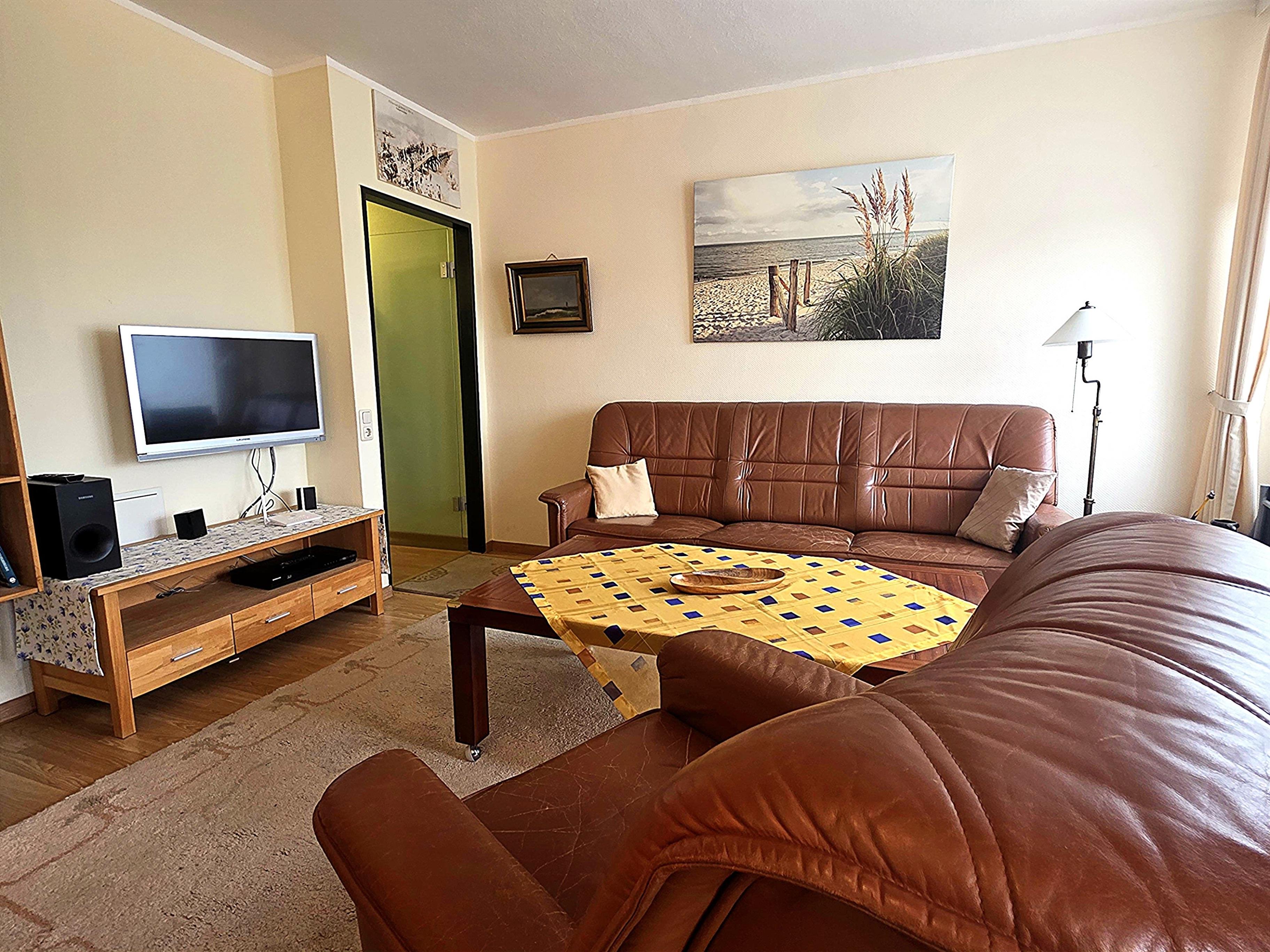 Komfortables Wohnzimmer mit bequemer Couchgarnitur, Flachbild-TV, Schrank, Anrichte & Zugang zum sonnigen, möblierten Süd-West-Balkon Meerblick.
