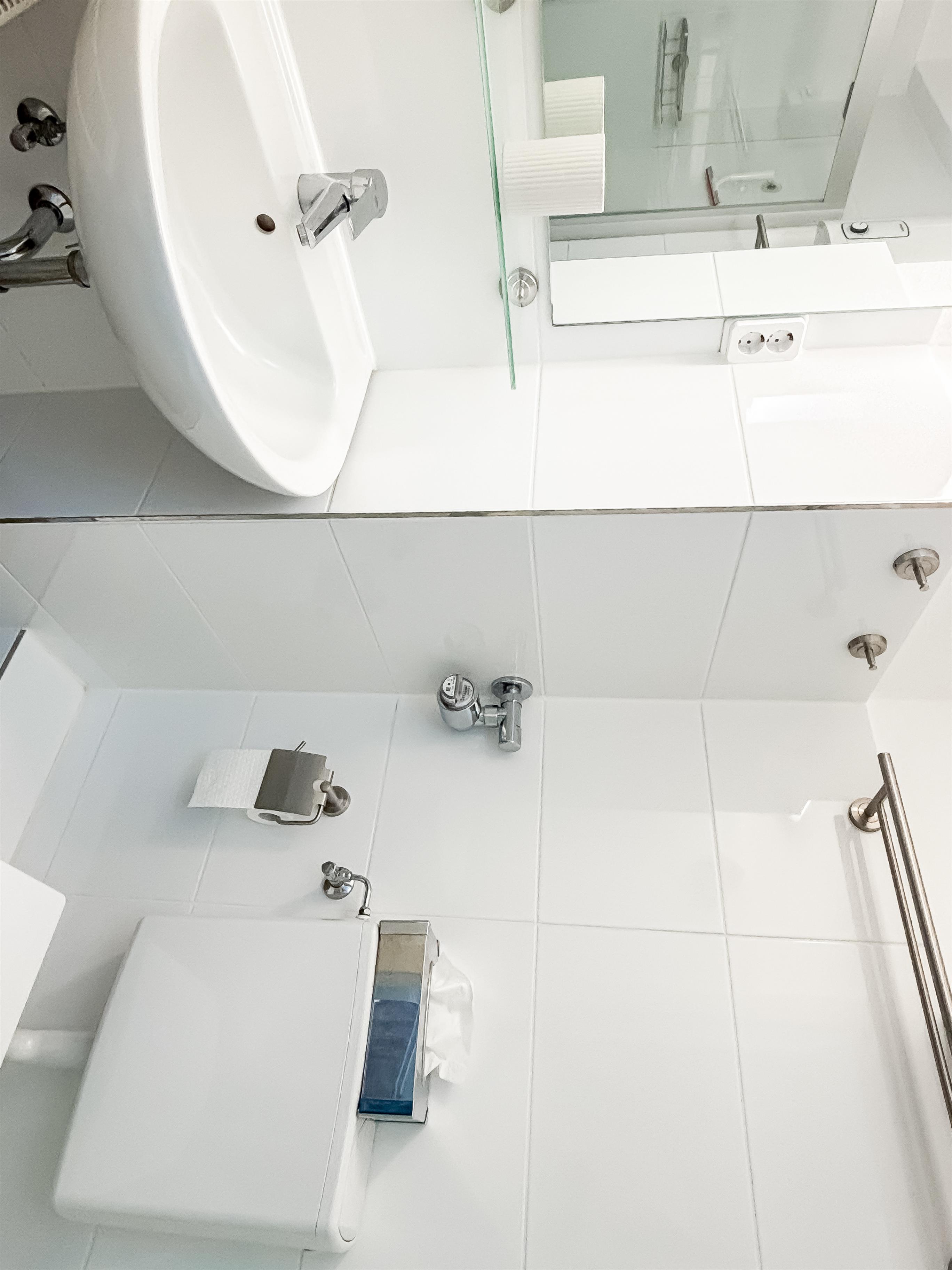 Helles, modernes Bad mit Duschkabine, WC und Waschbecken.