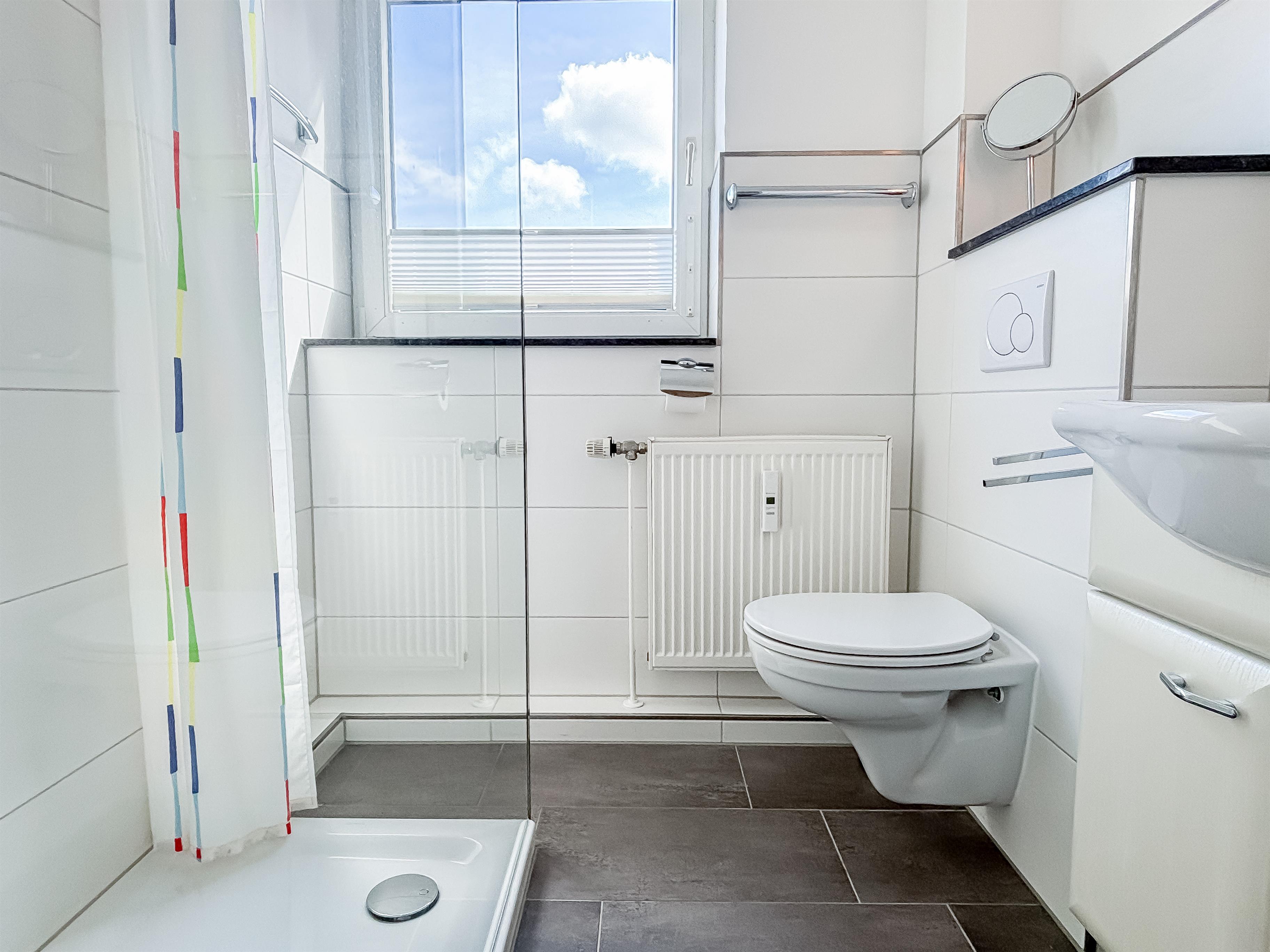Das neue, moderne Duschbad ist mit Waschbecken und WC ausgestattet.