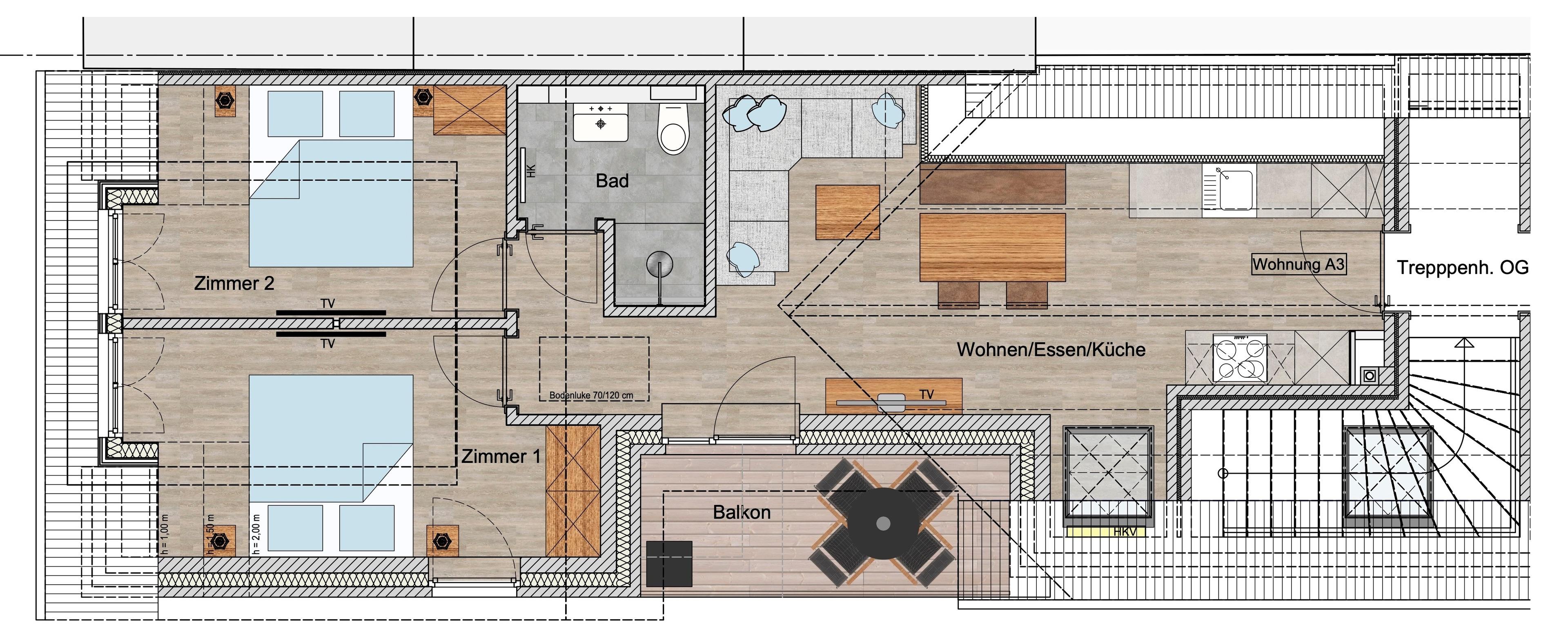 Das Apartment A3 mit seinem raffinierten Wohnkonzept und seinem Sonnen-Balkon bietet den optimalen Urlaubsrahmen für Paare oder auch Familien. Die Dachgeschosswohnung mit besonderer Wärme- und Schallisolierung ist besonders umfangreich ausgestattet und wirkt sowohl für Design-Liebhaber wie auch für den gemütlichkeitsliebenden Urlauber überzeugend und ansprechend.