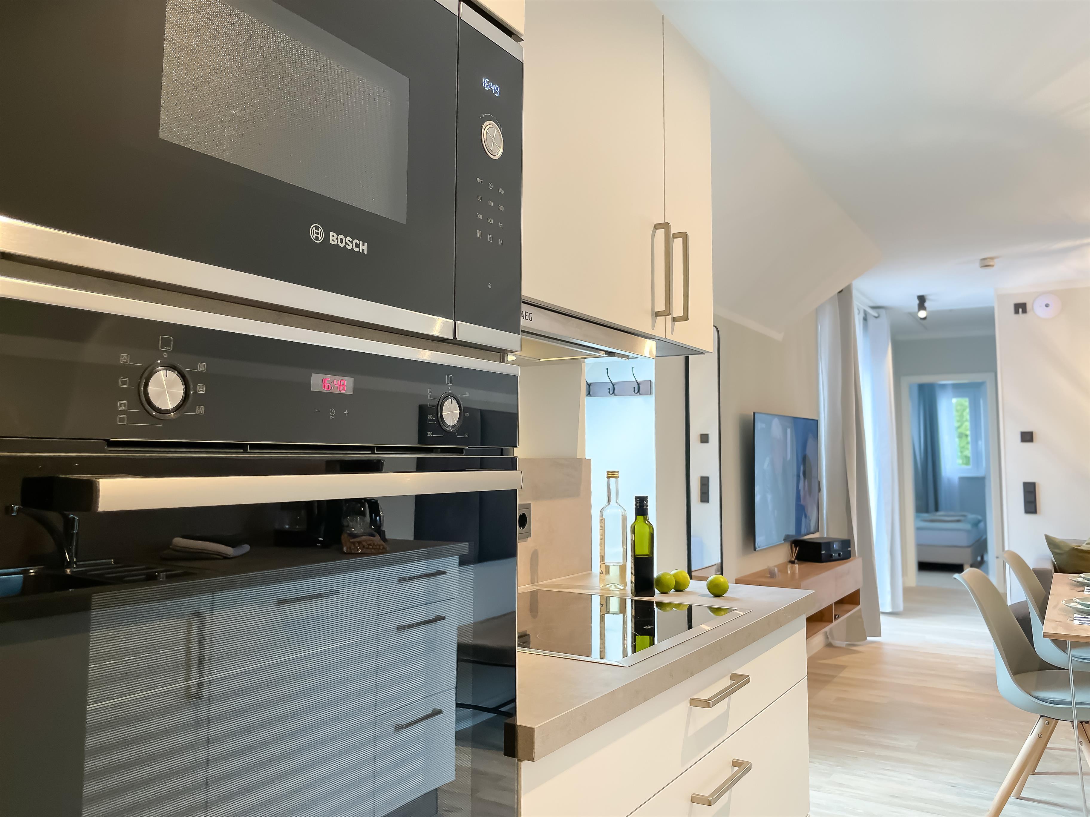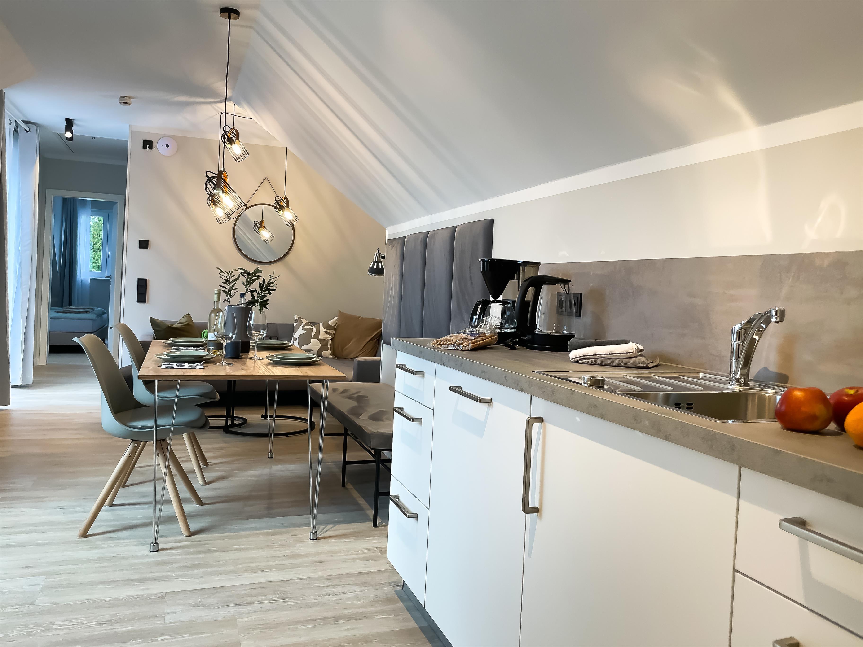 Zwei Schlafräume und ein besonders inszenierter Wohnbereich mit angrenzendem Essplatz und Komfortküche, in der auch der ambitionierte Urlaubskoch nichts vermisst, lassen den Ostsee-Urlaub entspannend und harmonisch werden.