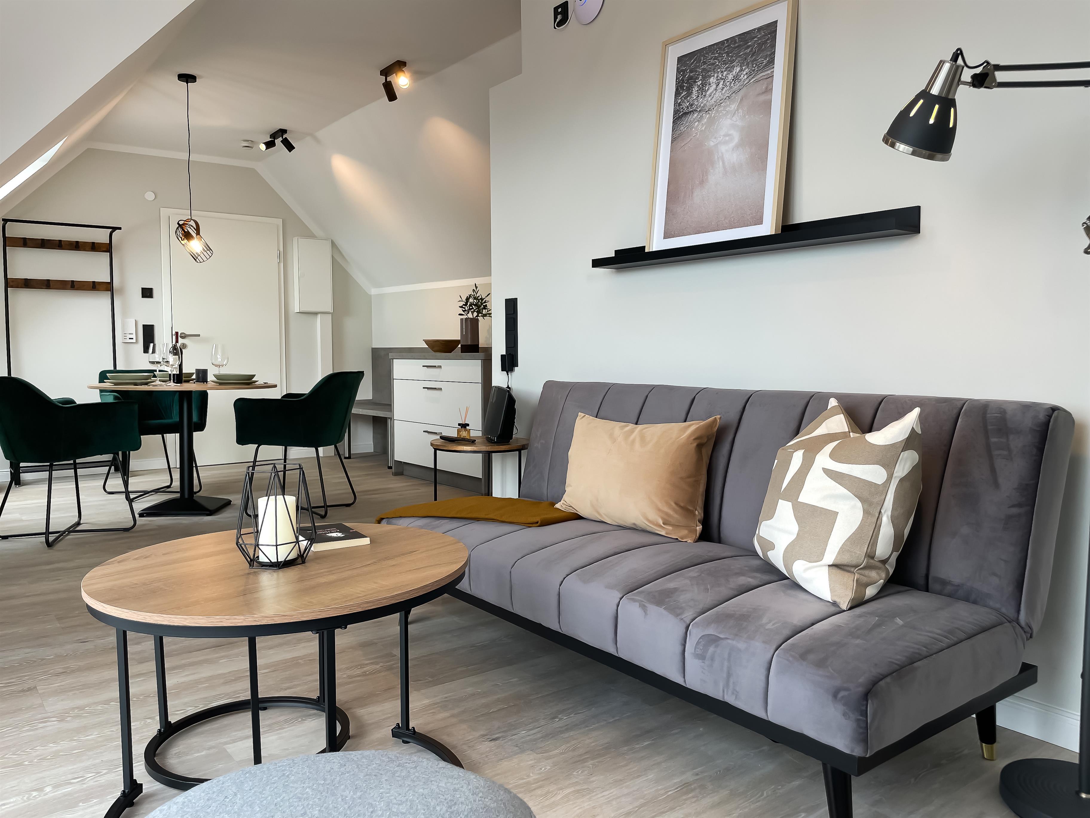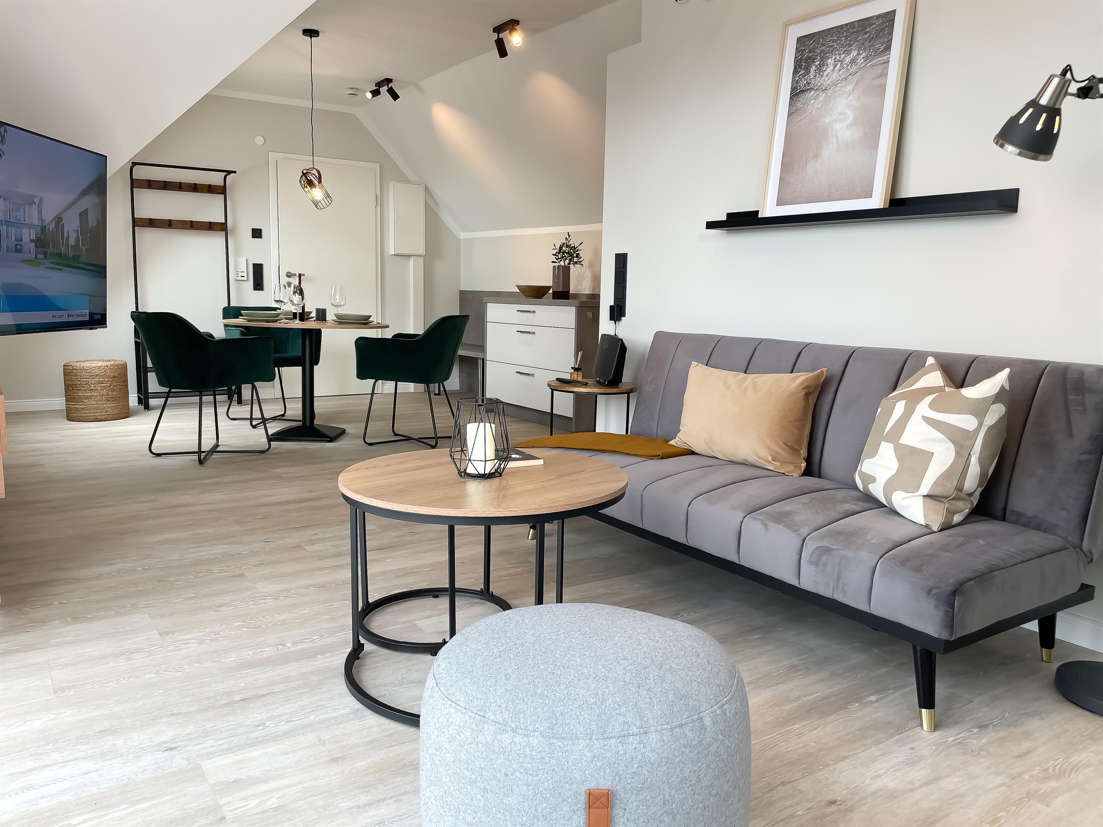 Auf 50 qm genießen zwei bis drei Personen besonderen Wohnkomfort. Schlafraum, Wohnschlafraum und Essbereich mit angrenzender Komfortküche sind nach einem besonderen Farb-, Material- und Lichtkonzept gestaltet. Von der stilvollen Couch blicken Sie auf den großen UHD Smart-TV oder aus dem großen Panorama-Fenster über die Dächer von Grömitz in unmittelbarer Deichlage.