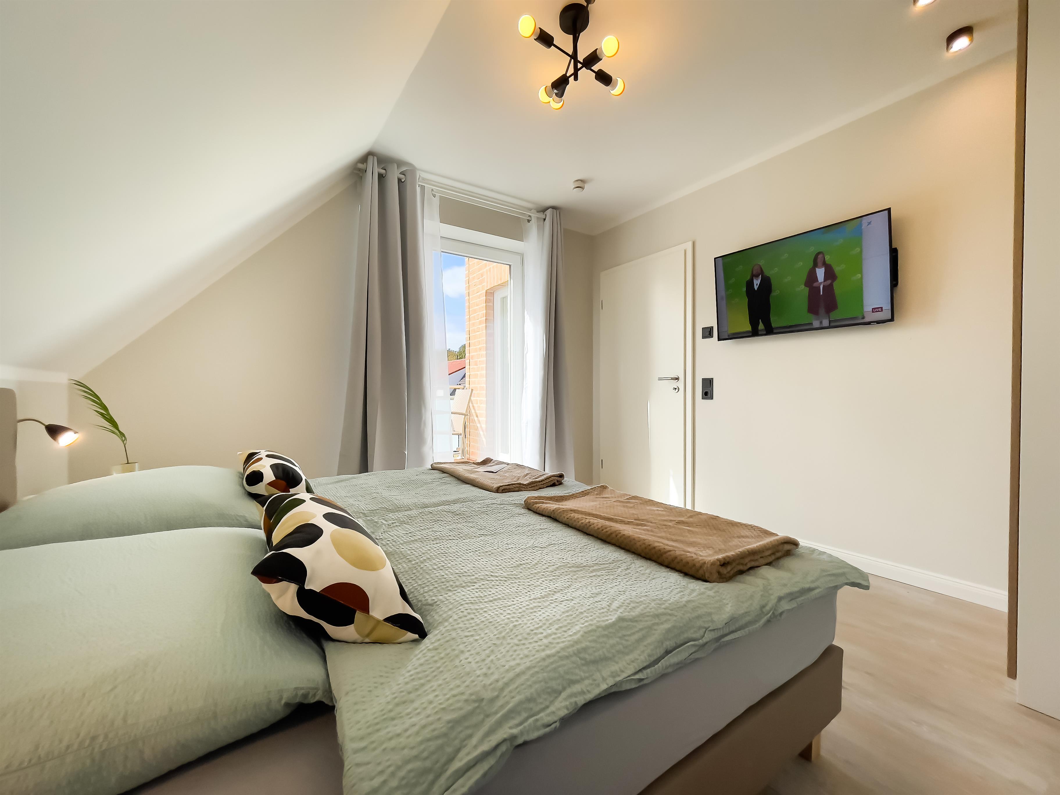 Ob Paare, Freunde oder die kleine Familie – das Raum- und Designkonzept dieses Domizils bereiten einfach jedem Urlaubsfreude. Alle Räume verfügen über Fußbodenheizung – auch das große Bad mit Regendusche. Modernste Ausstattung vom Smart-TV im Wohnraum, über den eigenen Fernseher im Schlafzimmer bis zum Highspeed-Internet und die Musikanlage sorgen – wenn gewünscht – für die nötige Ablenkung im Urlaub. Neben dem hochwertigen Hotelbett (Boxspring) im Schlafraum gibt es einen weiteren Schlafplatz auf der Schlafcouch im Wohnbereich.