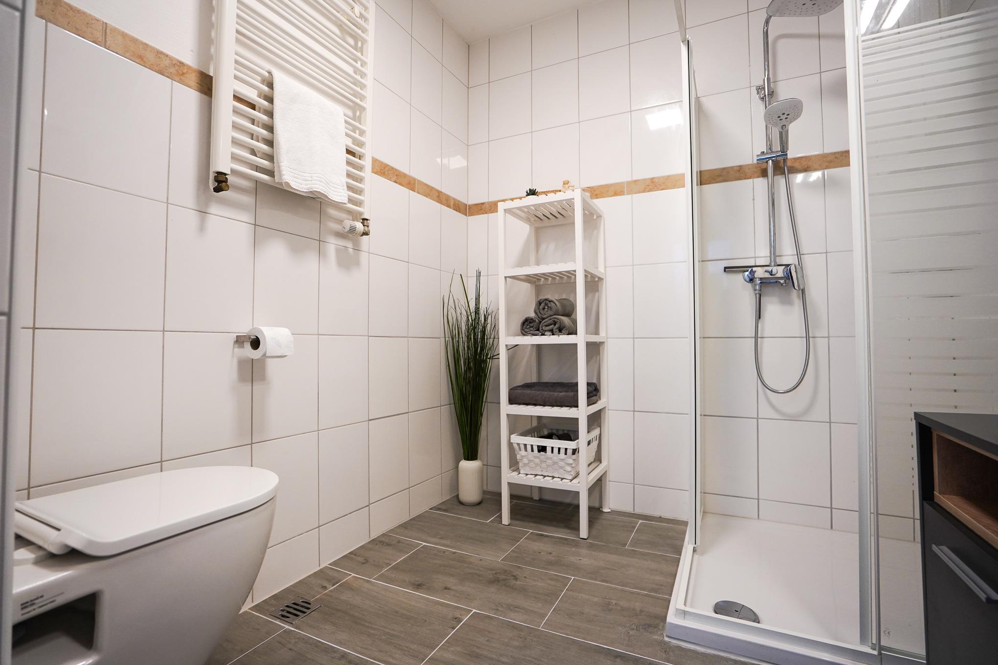 Des weiteren steht Ihnen ein hell gefliestes Duschbad zur Verfügung.