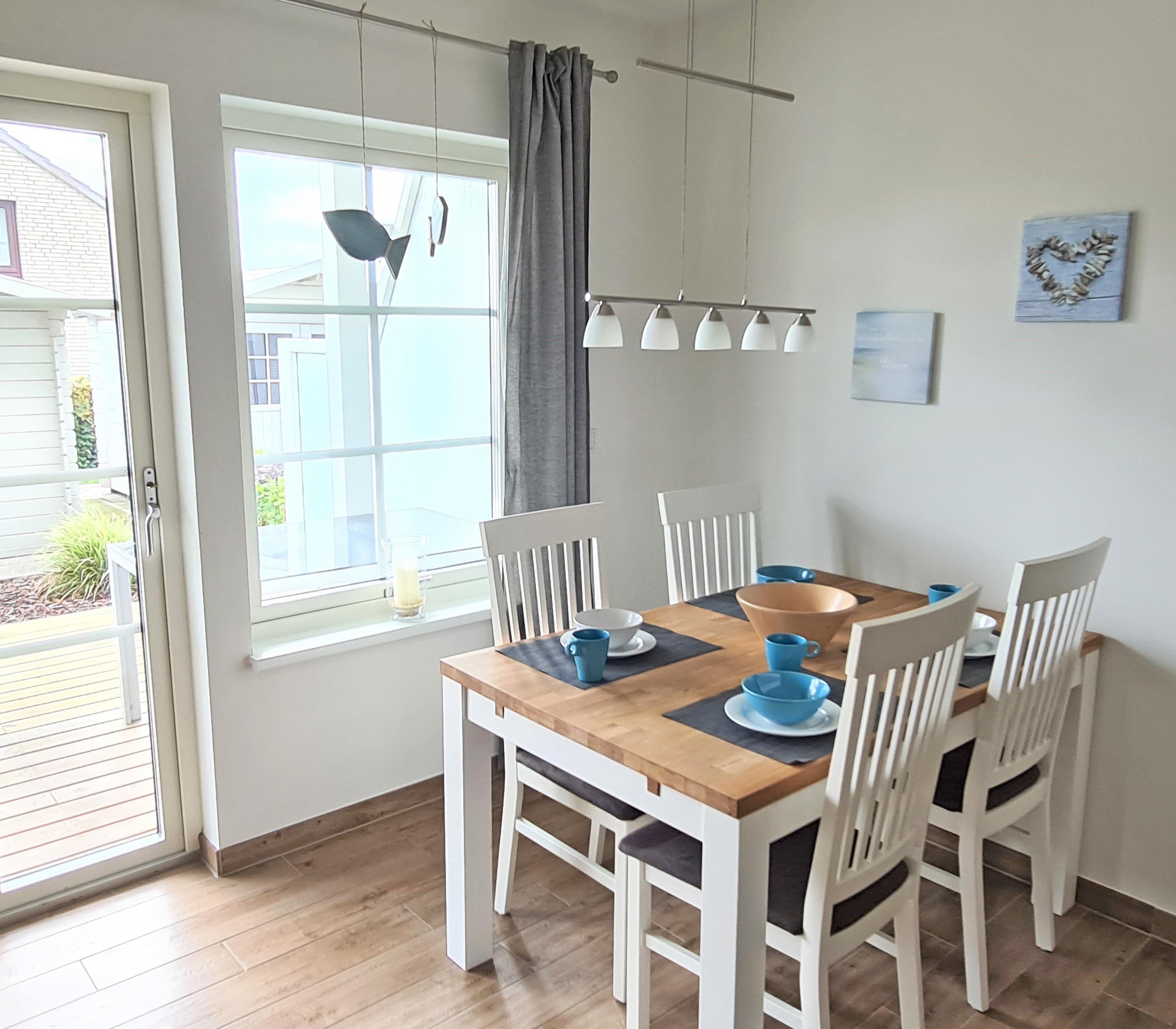 Modernes, geschmackvoll eingerichtetes Wohn- und Esszimmer mit Terrassenzugang. Das Wohn- und Esszimmer ist mit einem Schlafsofa, einem Sessel, einer Kommode und einem Essplatz mit 4 Stühlen ausgestattet. Das Zimmer ist mit Vinylboden ausgelegt. Zur Unterhaltung steht ein Sat-Fernseher zur Verfügung.