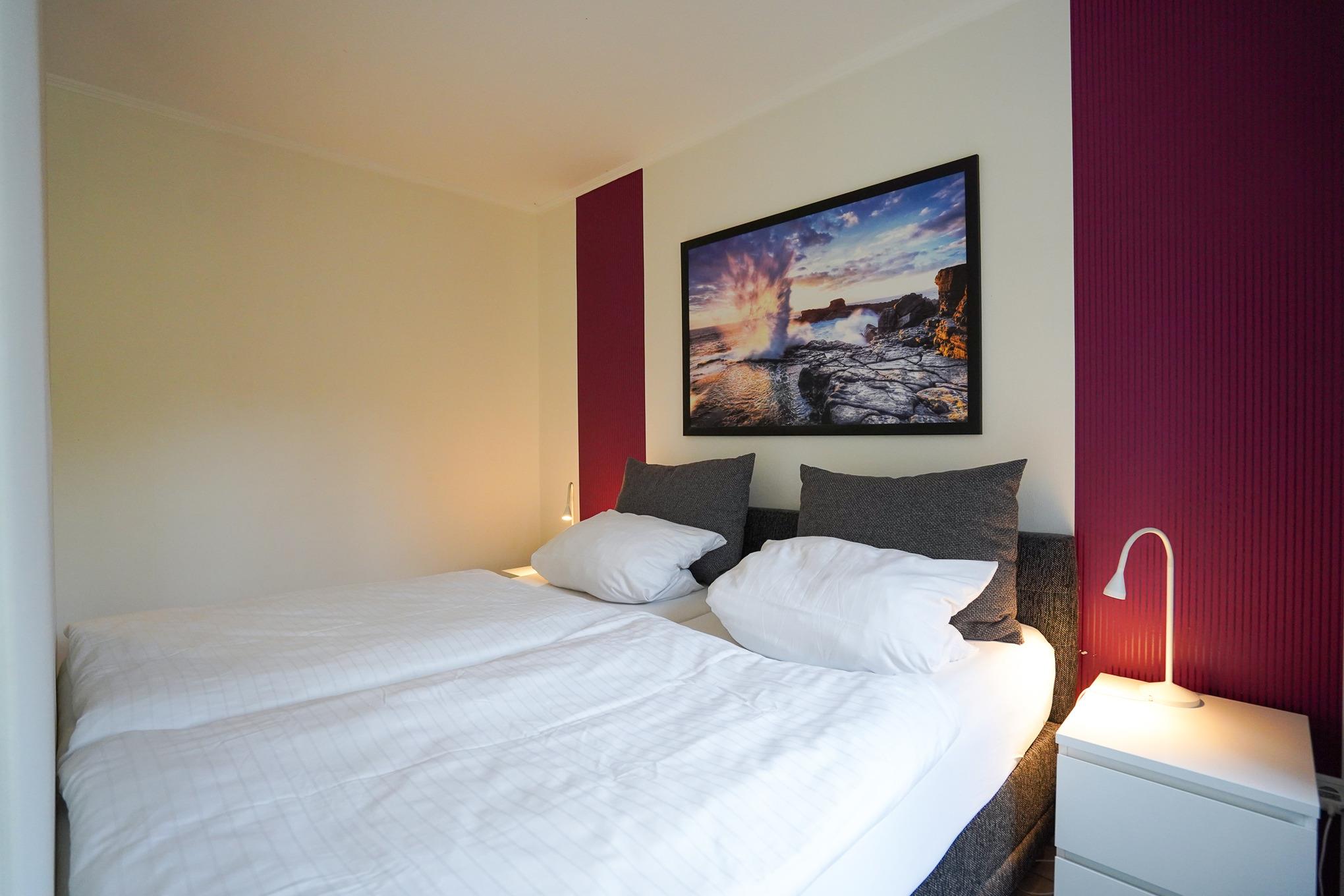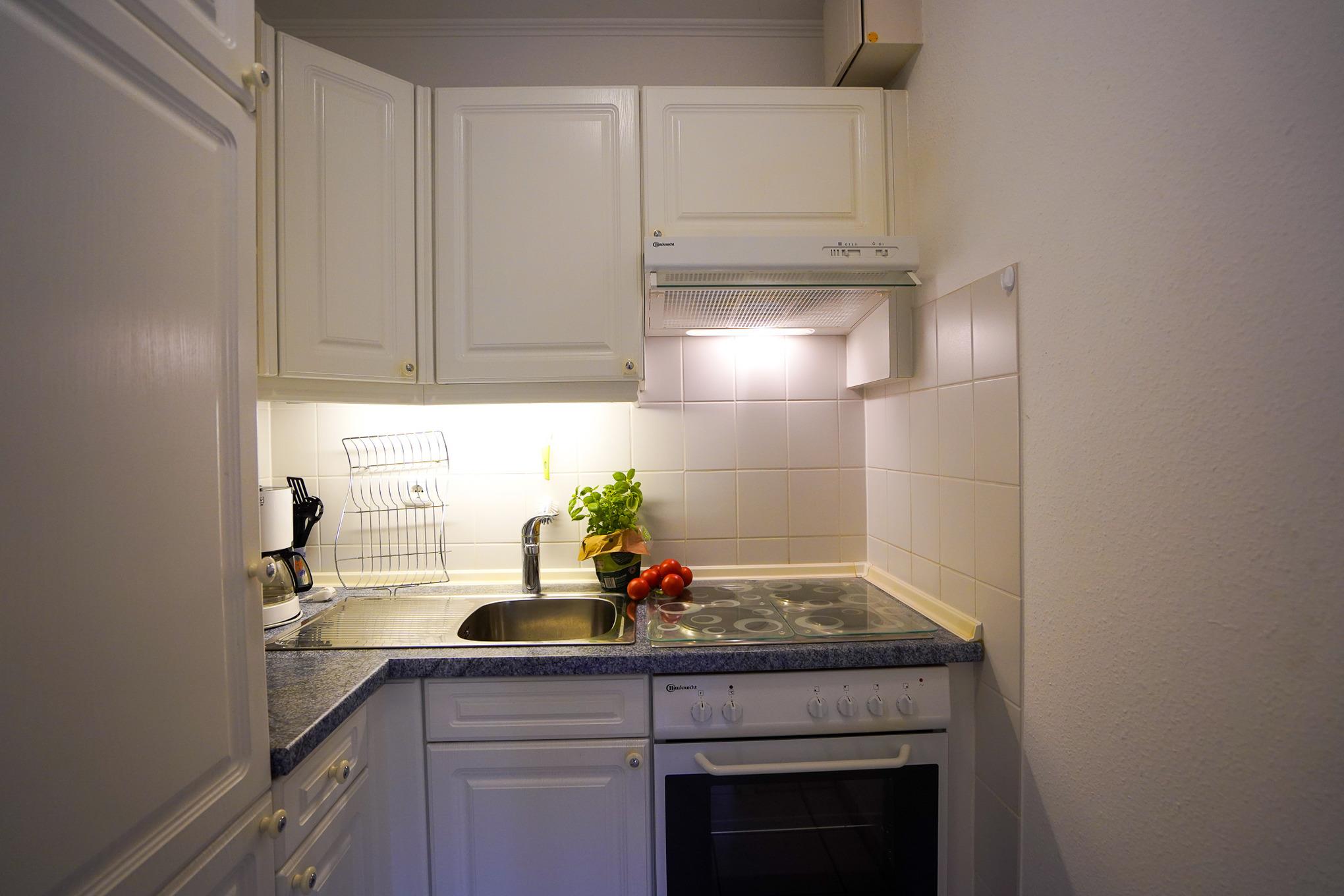 Im Schlafbereich befindet sich ein komfortables Boxspringbett (180x200 cm). Die separate Küche verfügt über alle notwendigen Elektrogeräte und Küchenhilfen.