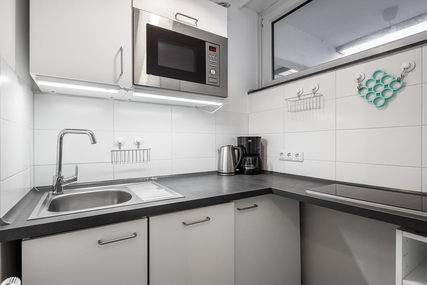 Die neue Küche ist mit einer Spülmaschine, Kühlschrank mit Gefrierfach, Mikrowelle und zwei Kochfeldern ausgestattet.