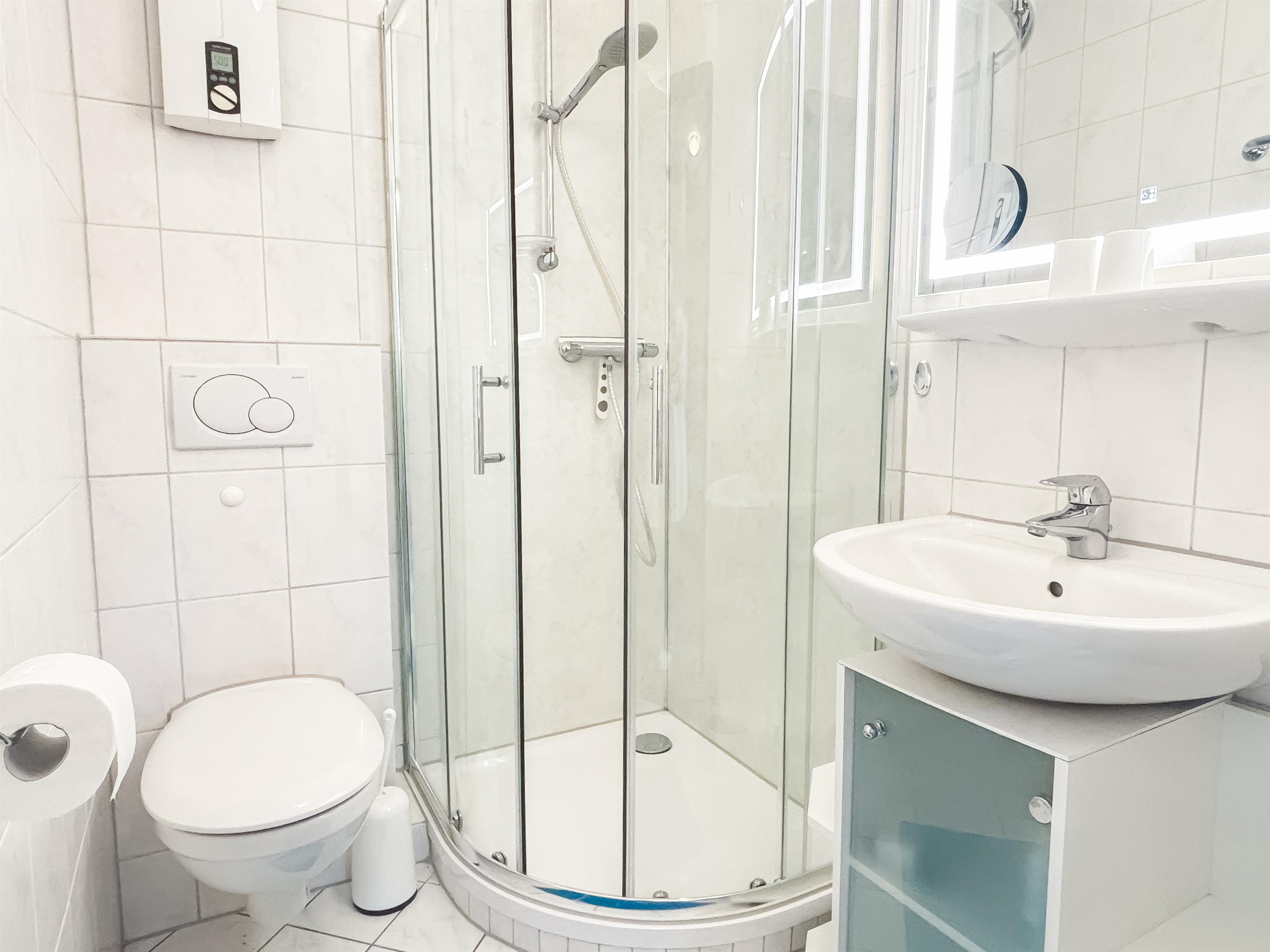 Das hell gefliestes Duschbad ist mit Eckdusche/ Glastrennwand, Waschbecken & WC ausgestattet.