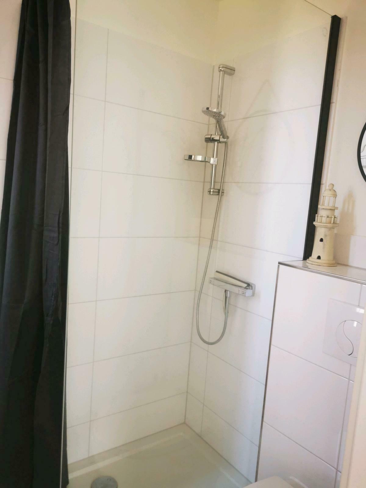 Ein Badezimmer mit einem WC, einer Dusche und einem Haartrockner ist ebenfalls vorhanden.