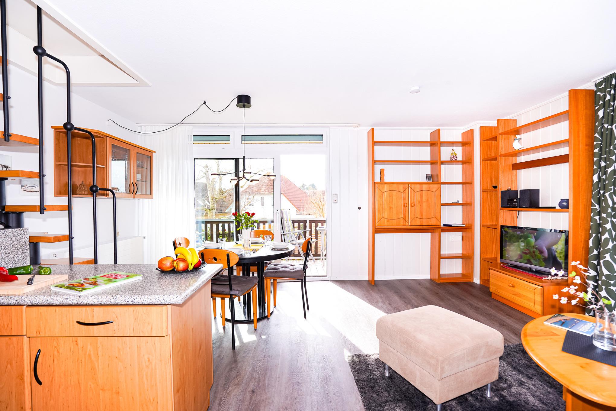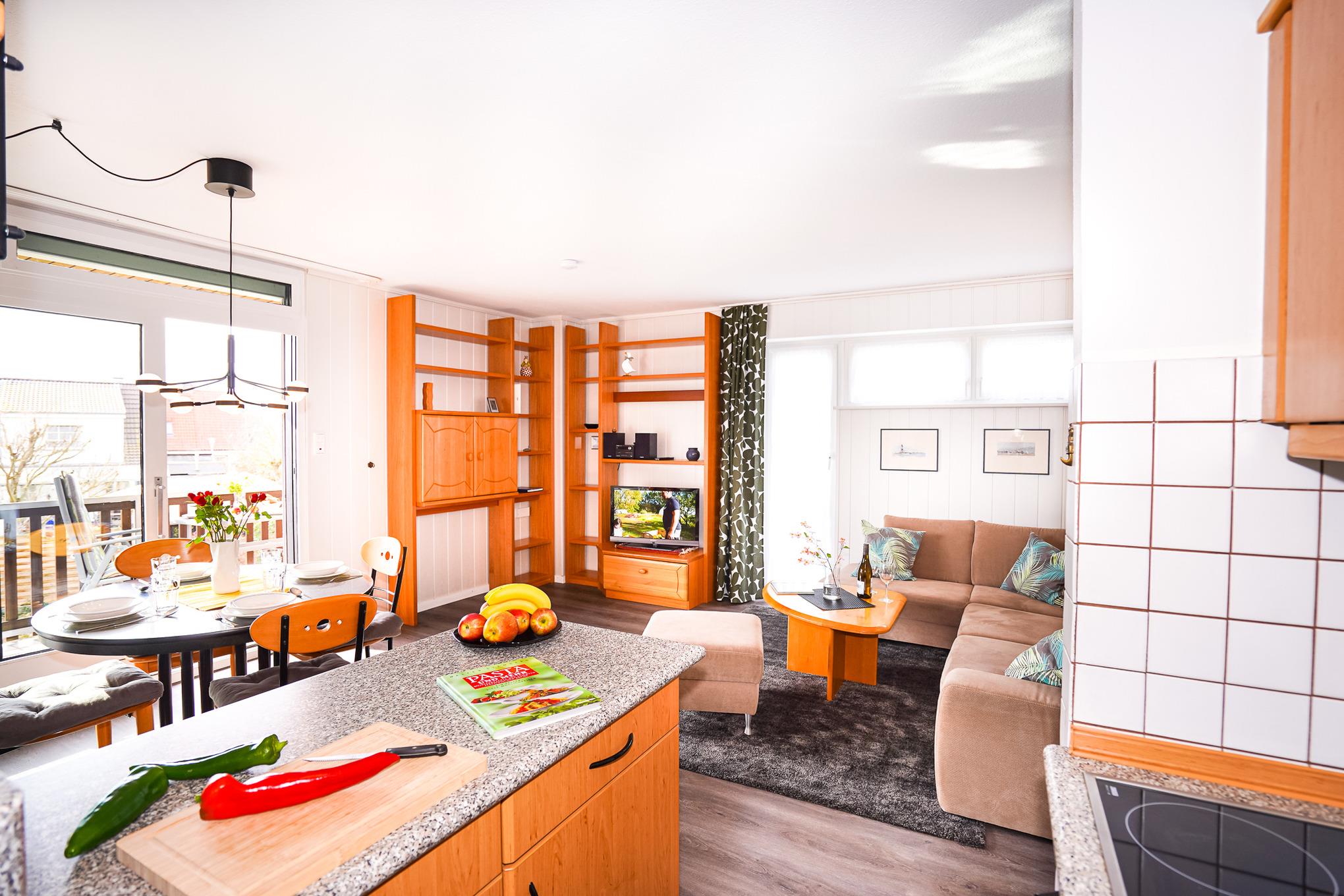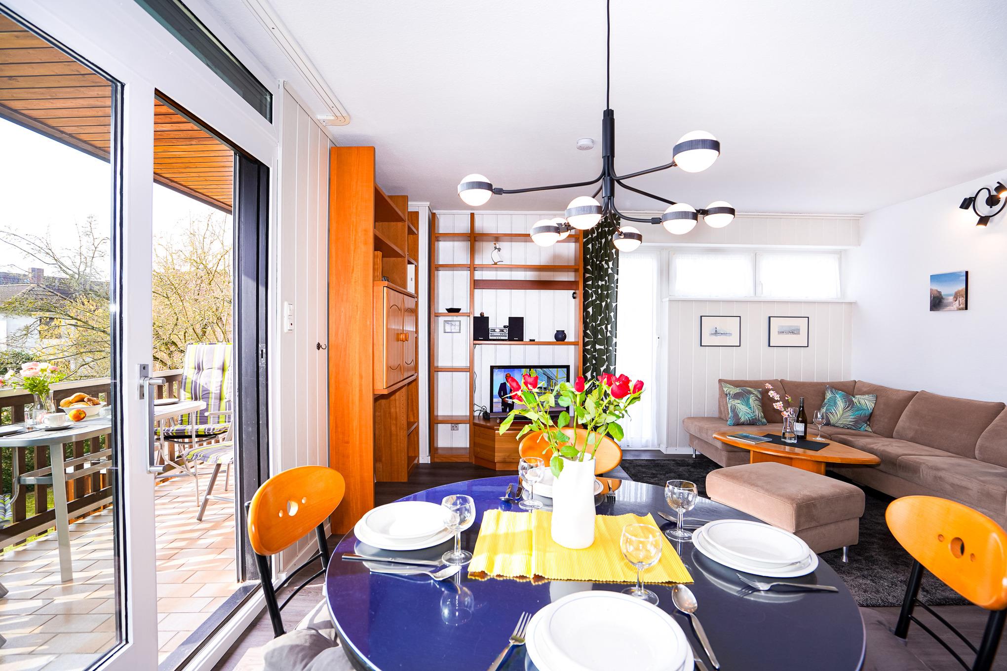 Das gemütliche Wohnzimmer ist ausgestattet mit einem schönen Sofa, Essplatz für 4 Personen, TV und hat Zugang zum möblierten Balkon.