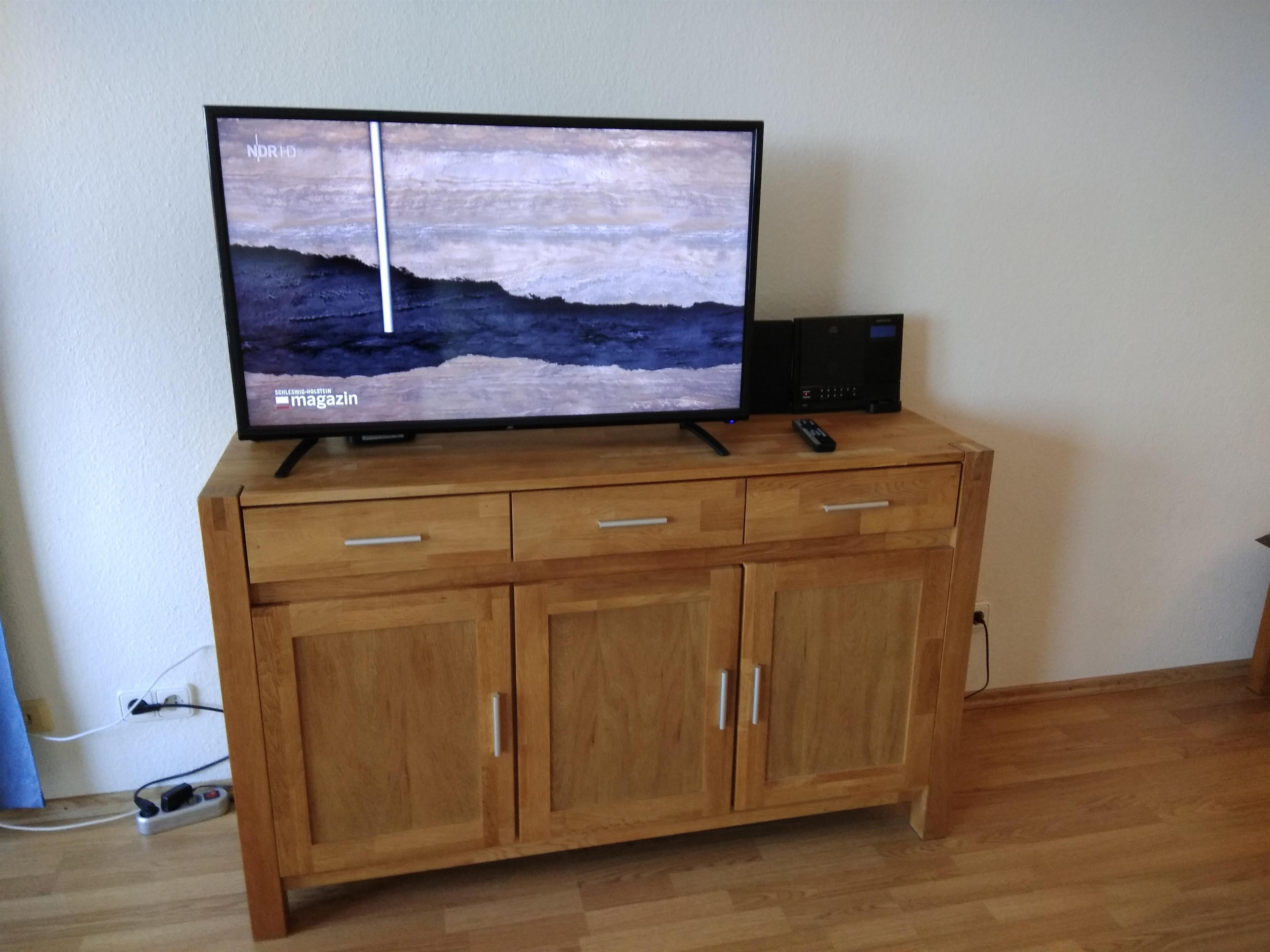Ein internetfähiger Sat-Flachbild-TV steht ebenso zur Verfügung wie eine kleine Stereokompaktanlage mit CD-Player.