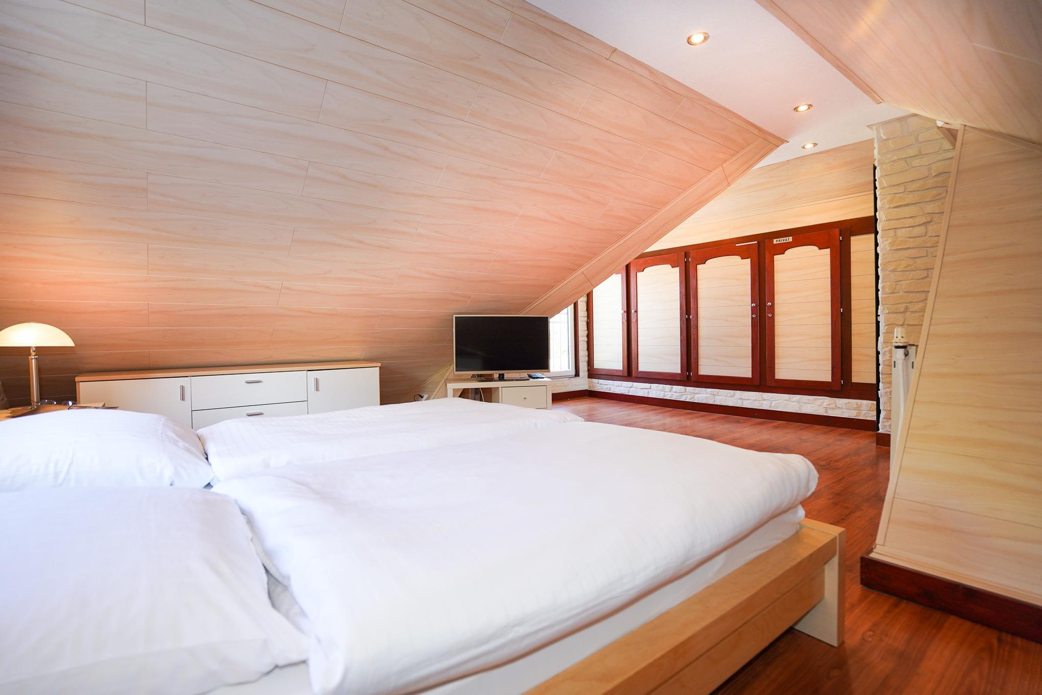 Im Obergeschoss des Hauses finden Sie zwei Schlafzimmer vor, welche insgesamt 4 Betten und 4 weitere Schlafmöglichkeiten auf Klappsofas für junge Gäste bieten. Das erste Schlafzimmer ist mit einem gemütlichen Doppelbett, 3 Kommoden und großzügigen Wandkleiderschränken ausgestattet. Hier finden Sie für junge Gäste Wickelauflage, Babybadewanne, Kinderklappbett, 2 Hochstühle, 1 Turn- und Spielmatte und Reserveklappstühle. Das zweite Schlafzimmer verfügt über zwei Einzelbetten und darüber hinaus in einem angrenzenden Bereich noch über zwei Schlafsofas - folglich 6 Schlafgelegenheiten zur flexiblen Nutzung und im Eingangsbereich über ein Kinderschutzgitter. Ausreichend Ablagefläche für Ihre Kleidung ist natürlich vorhanden. Hier finden Ihre Kinder Platz zum Toben, Spielen oder Fernsehen. Ein Schreibtisch mit Maus & Monitor steht für Ihren Laptop bereit. Natürlich bietet sich dieser Bereich auch für zwei Erwachsene perfekt an.