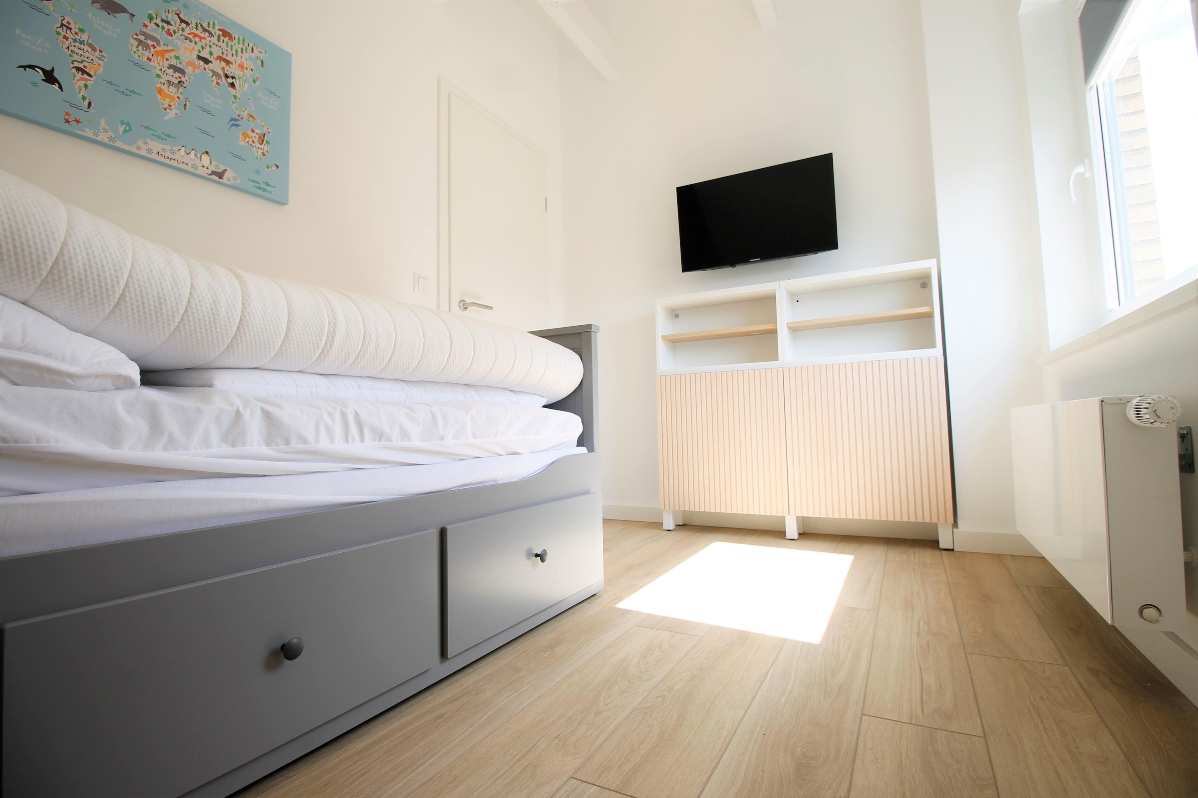 Das Schlafzimmer bietet mit seinem Boxspringbett aus hochwertigen Taschenfedern einen hohen Schlafkomfort und verfügt über einen eigenen Fernseher und eine Terrasse. Auch das zweite Schlafzimmer ist mit einem eigenen Fernseher ausgestattet und bietet mit einem ausziehbaren Kojenbett die Möglichkeit eines Einzel- als auch Doppelbettes.