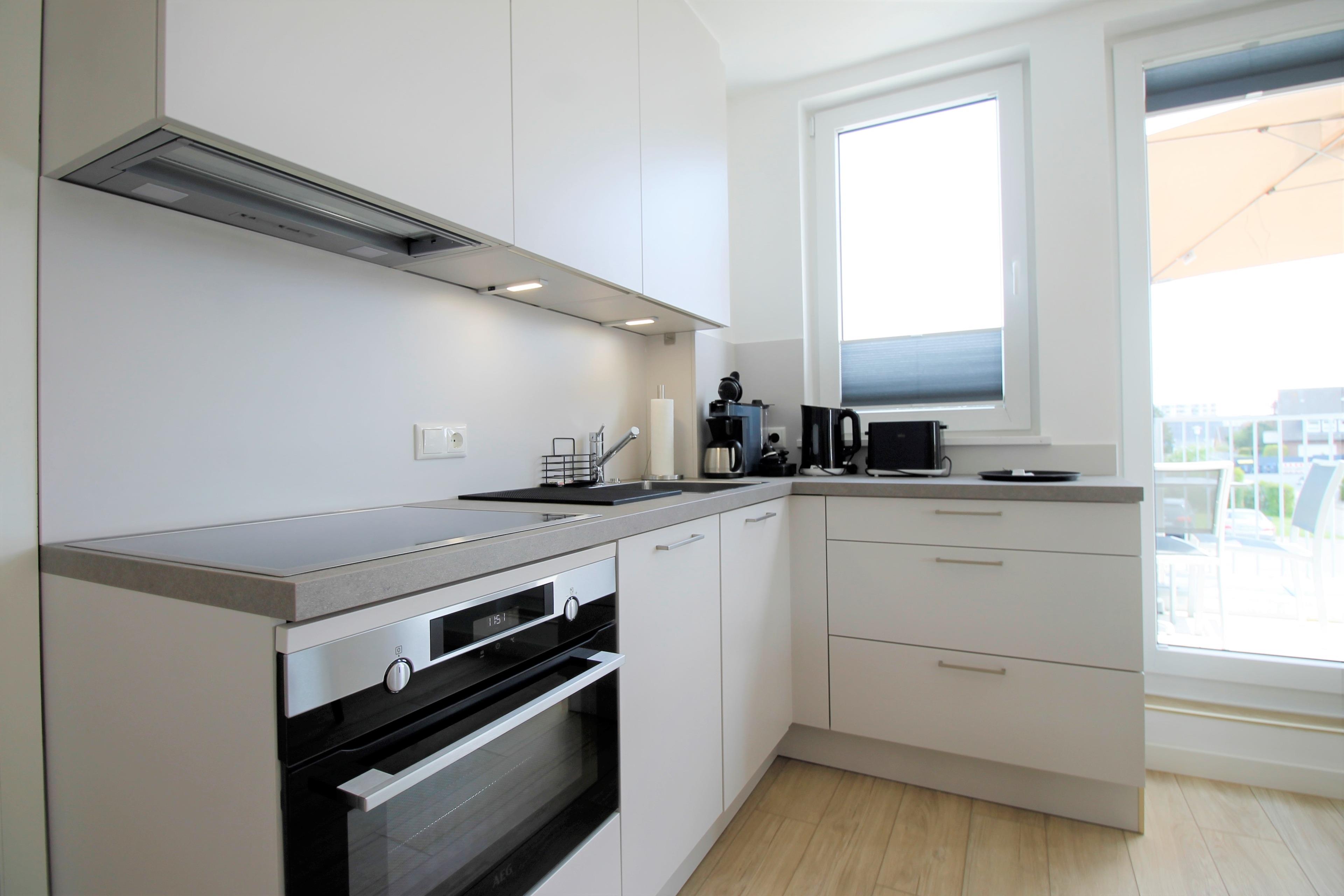 Die moderne Einbauküche ist u.a. mit Gefrierfach, Kaffeemaschine (Filter- und Espressomaschine), 4-Platten-Induktionsherd, Backofen-Mikrowellenkombigerät und einer Spülmaschine ausgestattet.