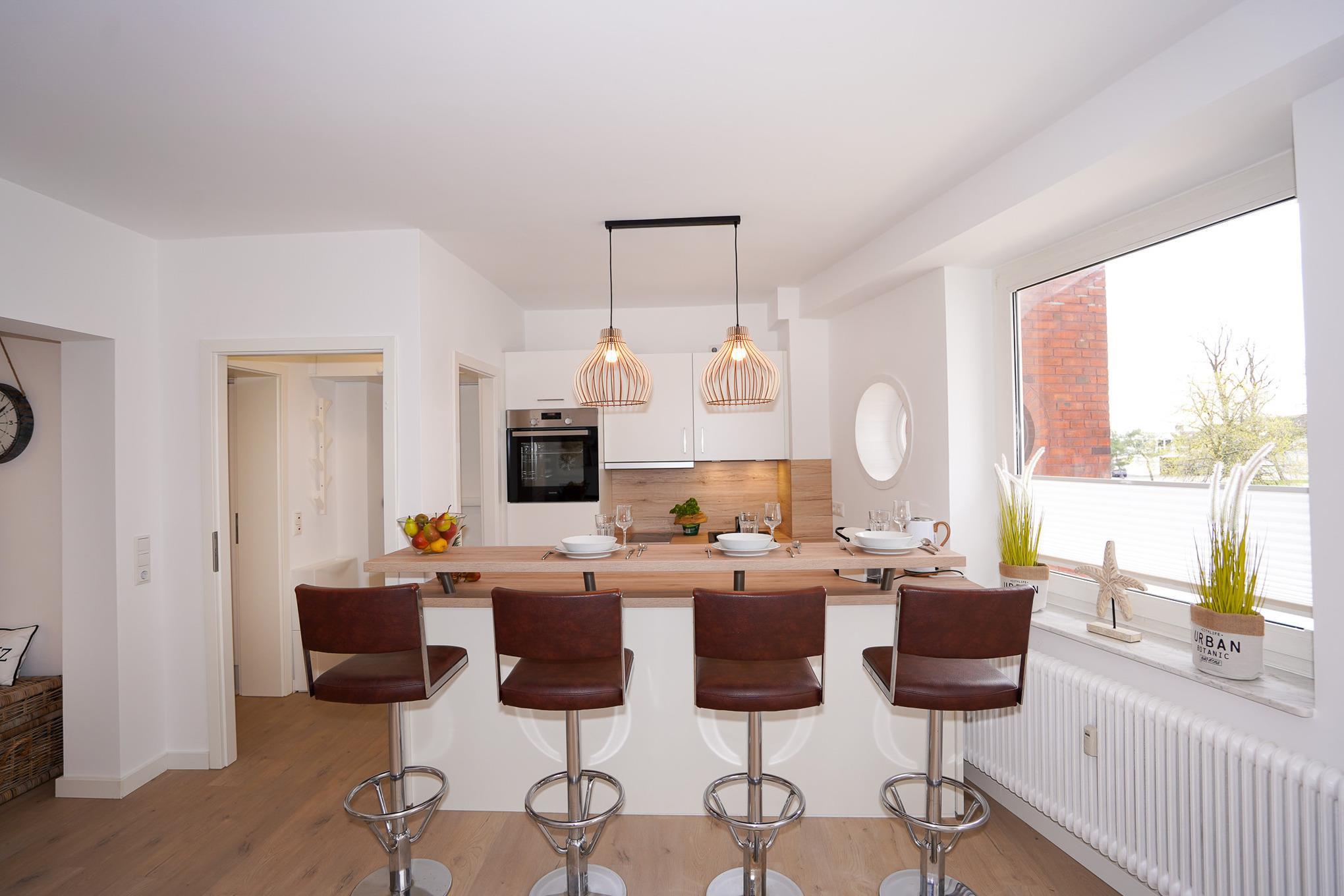 Die hochwertige und neue Küchenzeile ist sehr gut ausgestattet. Sie finden hier selbstverständlich eine Geschirrspülmaschine, einen Backofen, Kühlschrank mit Gefrierfach und diverse Elektrokleingeräte. Ihre Mahlzeiten nehmen Sie an dem gemütlichen Tresen zu sich. Abgerundet wird die Wohnung mit einem funktionalen und weiß gefliesten Badezimmer. Kostenloses W-LAN ist in dieser Ferienwohnung selbstverständlich vorhanden