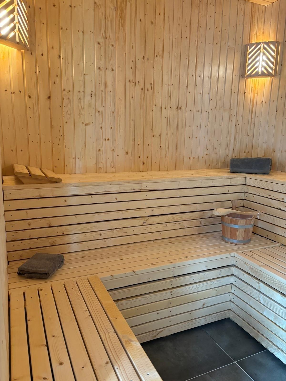 Im Garten befindet sich ein Wellnesshaus mit Sauna, Whirlbadewanne, Dusche, WC und Ruhebereich mit TV.