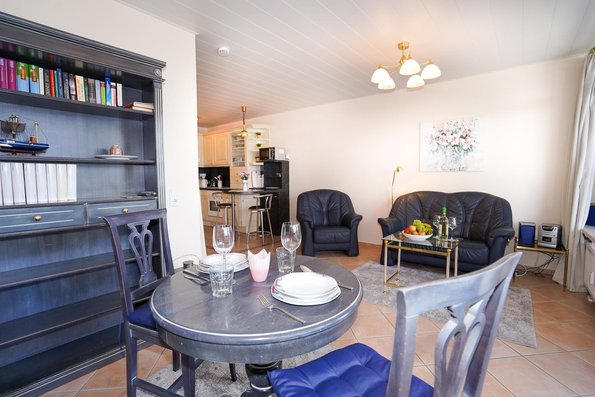 Die offene Pantryküche mit Kühlschrank, Backofen, Ceranfeld, Mikrowelle mit Backfunktion, Toaster, Kaffeemaschine und Wasserkocher lässt keine Wünsche offen. Angrenzend an die Küche erwartet Sie ein kleiner Tresen für das schnelle Frühstück oder einen Kaffee zwischendurch.