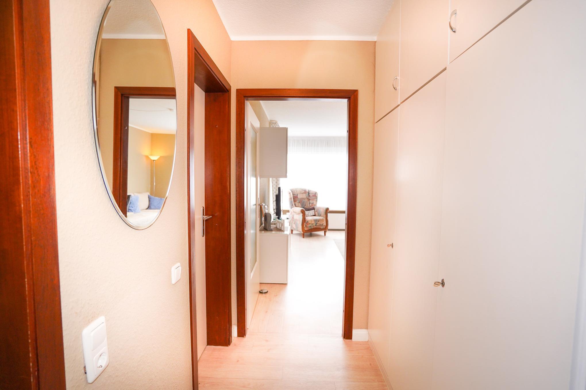 Das Schlafzimmer ist mit einem Doppelbett und einer Kommode ausgestattet. Große Einbauschränke im Flurbereich bieten ausreichend Platz für die Urlaubsgarderobe. Im Badezimmer finden Sie eine Badewanne mit Duschvorrichtung, WC, Waschbecken und Handtuchheizkörper vor.