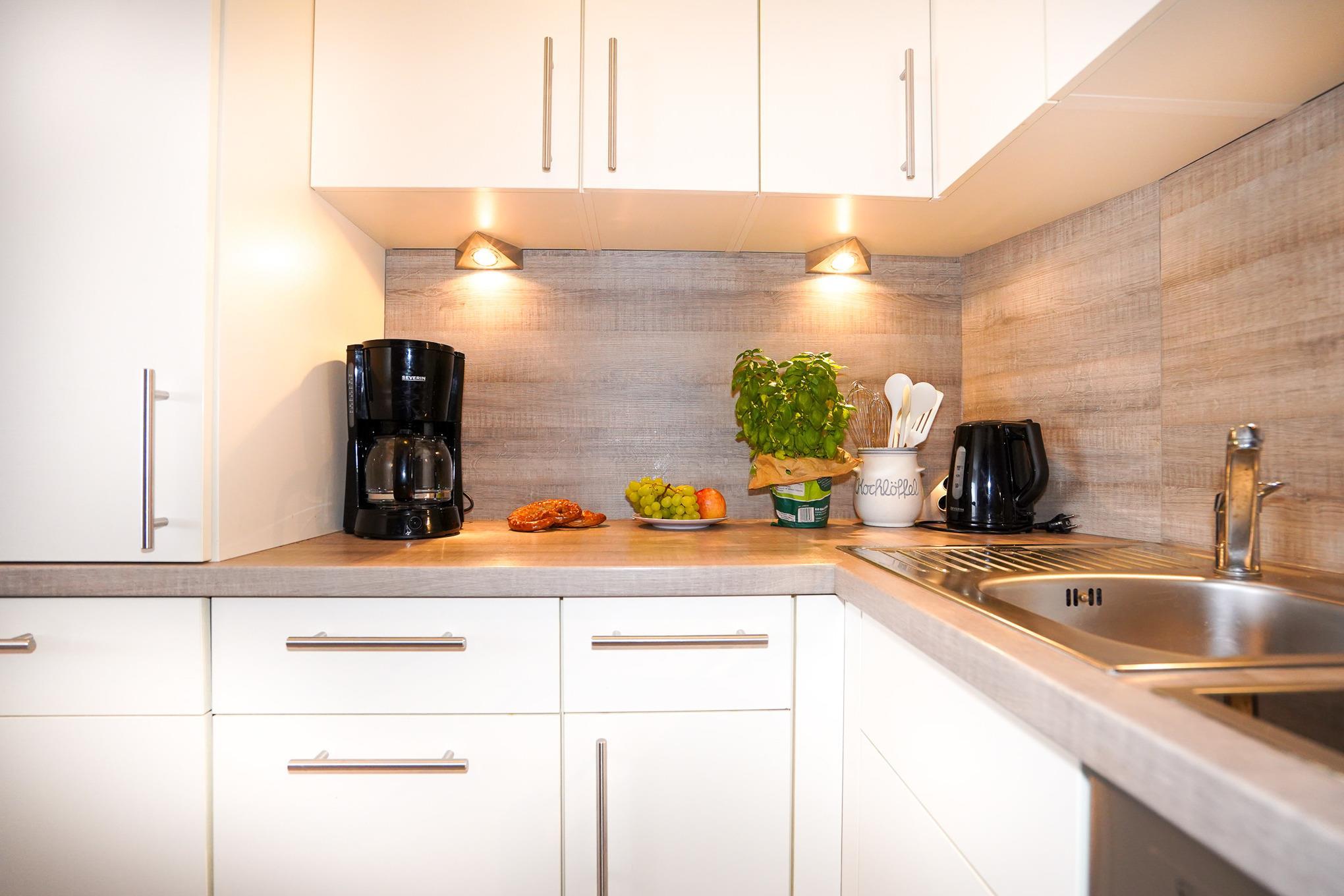 Die moderne halb offen gestaltete Küche ist voll ausgestattet und bietet unter anderem ein Cerankochfeld, Backofen, Kühlschrank mit Gefrierfach, Spülmaschine und weitere kleine Küchenhelfer wie Kaffeemaschine, Wasserkocher und Toaster.