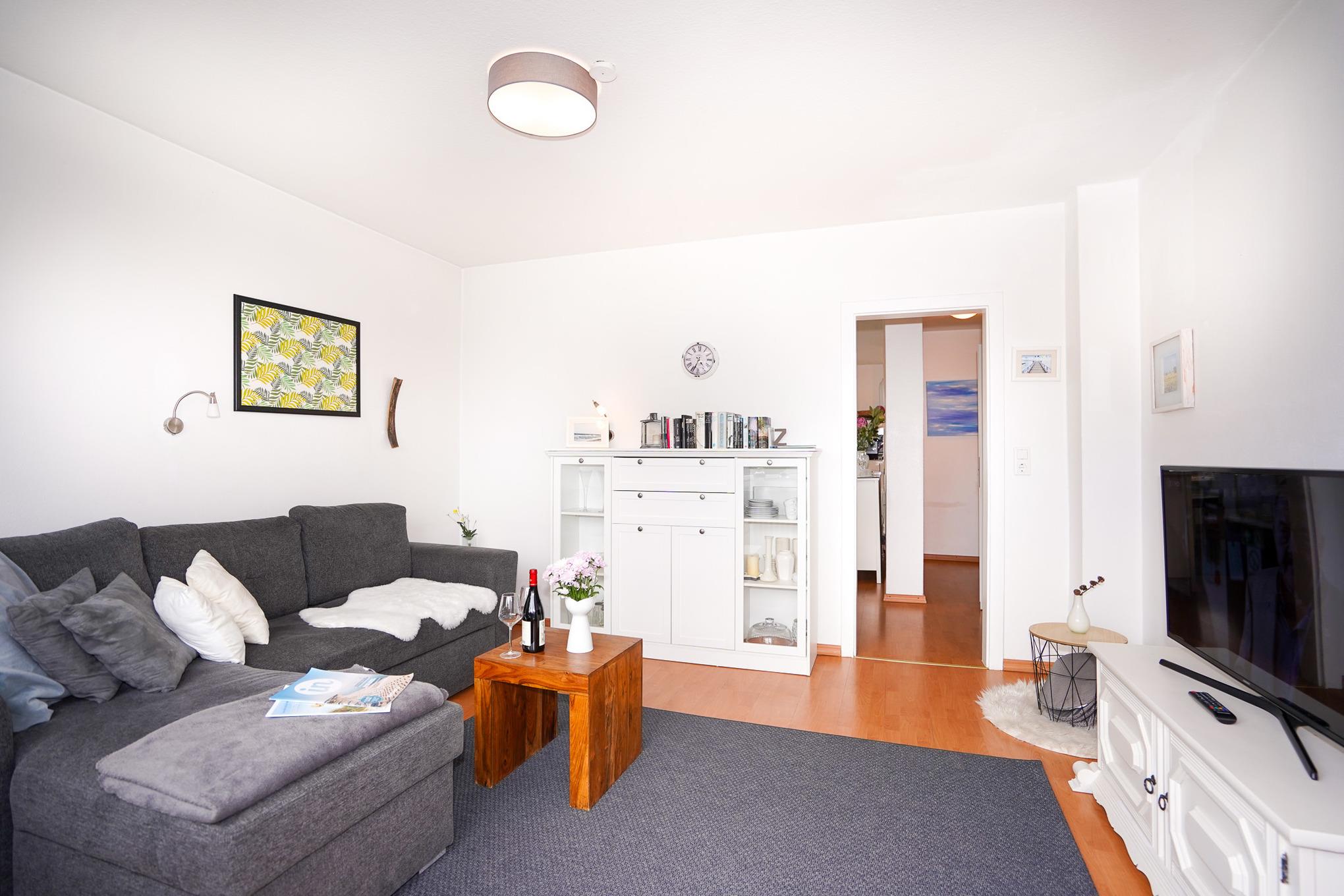 Diese helle und gemütliche, ca. 86 m² große Wohnung mit Einzelgaragenstellplatz (240 Breite x 200 Höhe x 500 Tiefe cm) und kostenlosem W-LAN befindet sich nur ca. 200 Meter entfernt vom Strand. Einkaufsmöglichkeiten und Restaurants befinden sich in unmittelbarer Nähe.