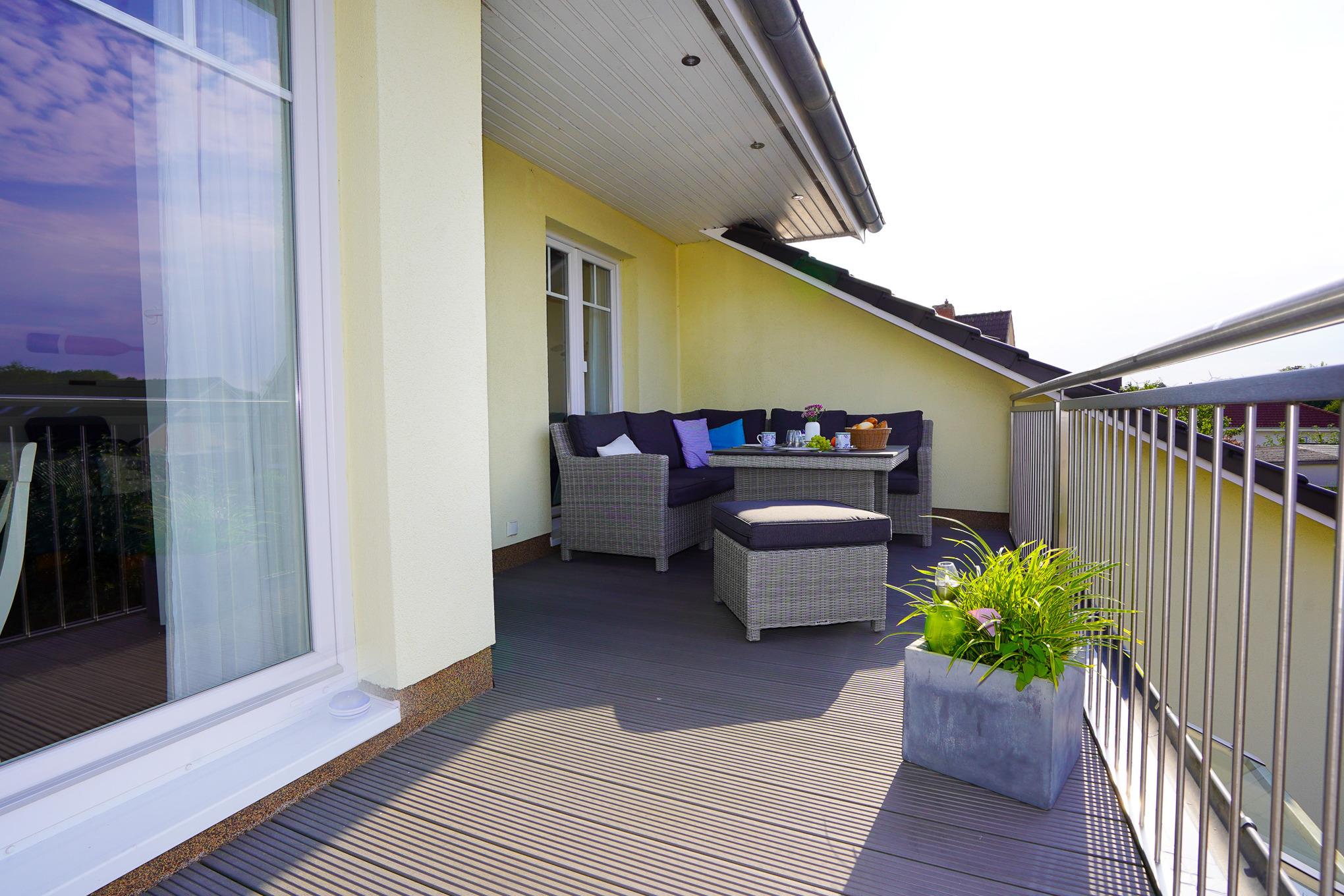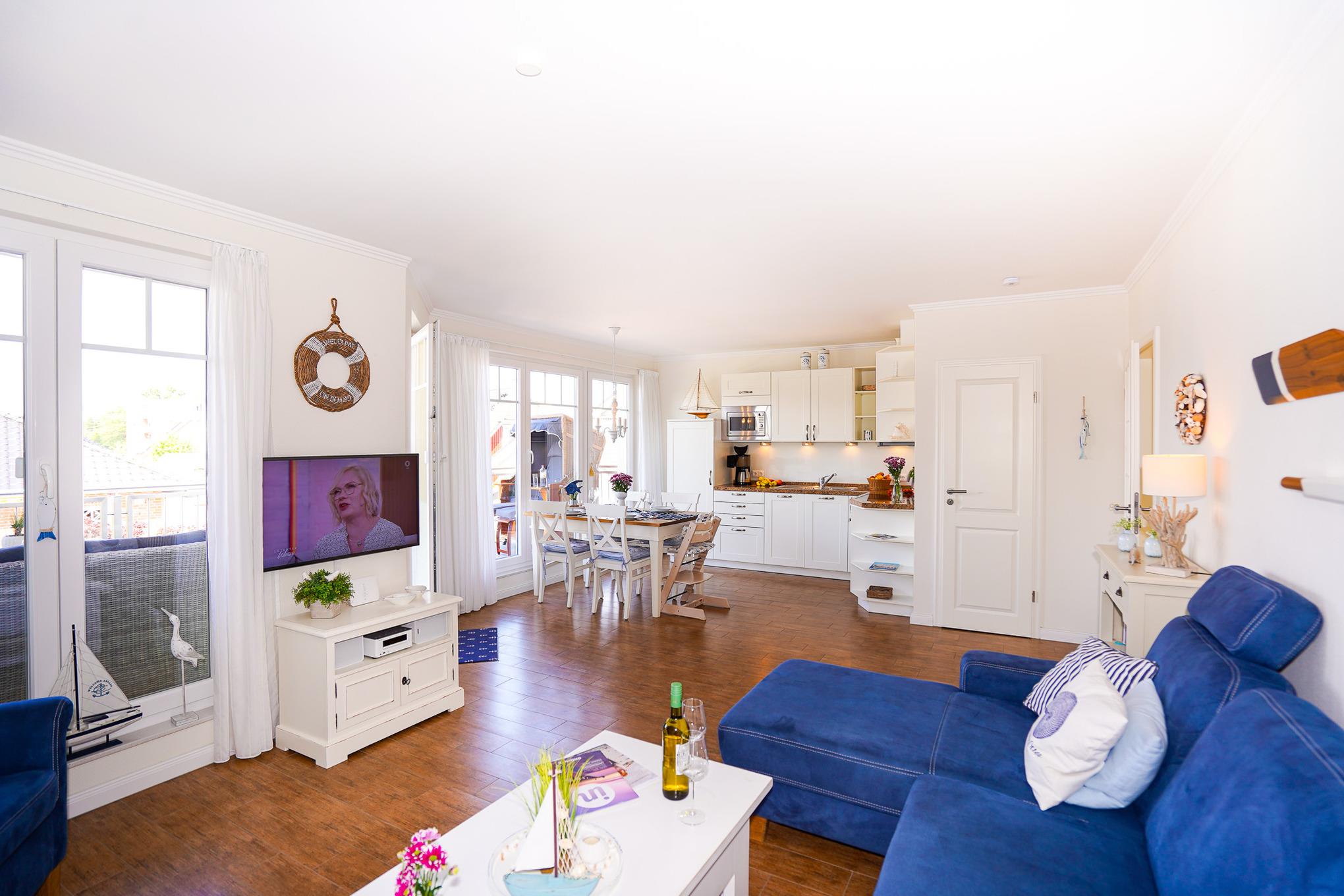 Zwei separate Schlafzimmer und die zwei Bäder lassen den Feriengästen ihren individuellen Freiraum. Im ersten Obergeschoss befindet sich der große Wohn-/Essraum mit offener Landhausküche und einem 18 m² angrenzenden großen Balkon.