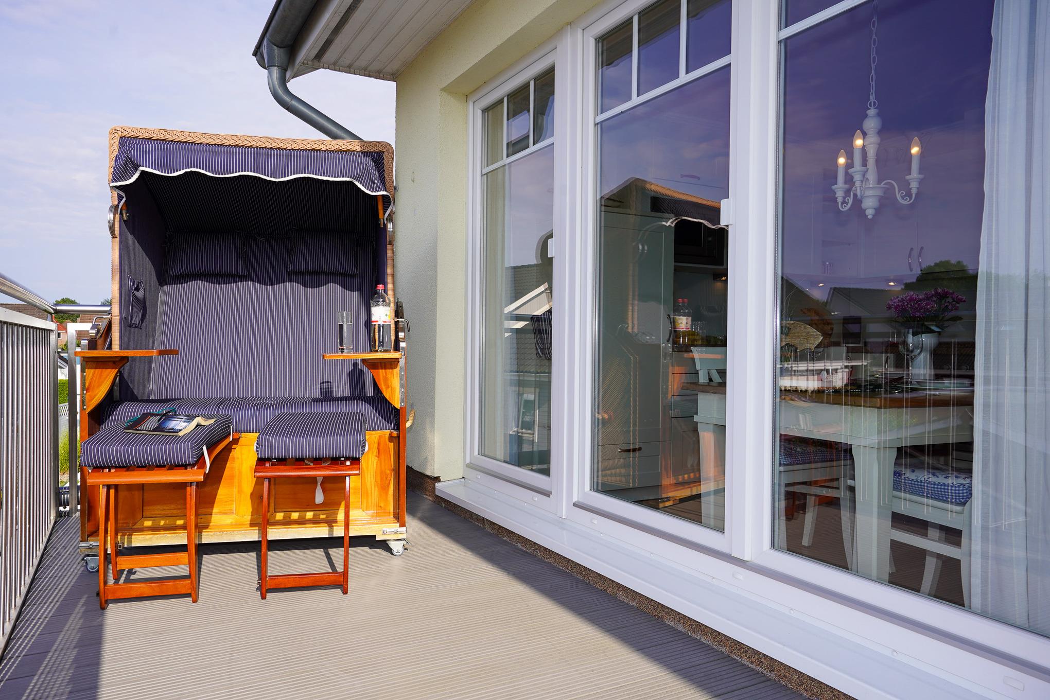 Moderne Ferienwohnung in Grömitz mit Balkon, zwei Schlafzimmern und maritimem Landhausstil für erholsame Tage am Meer.
