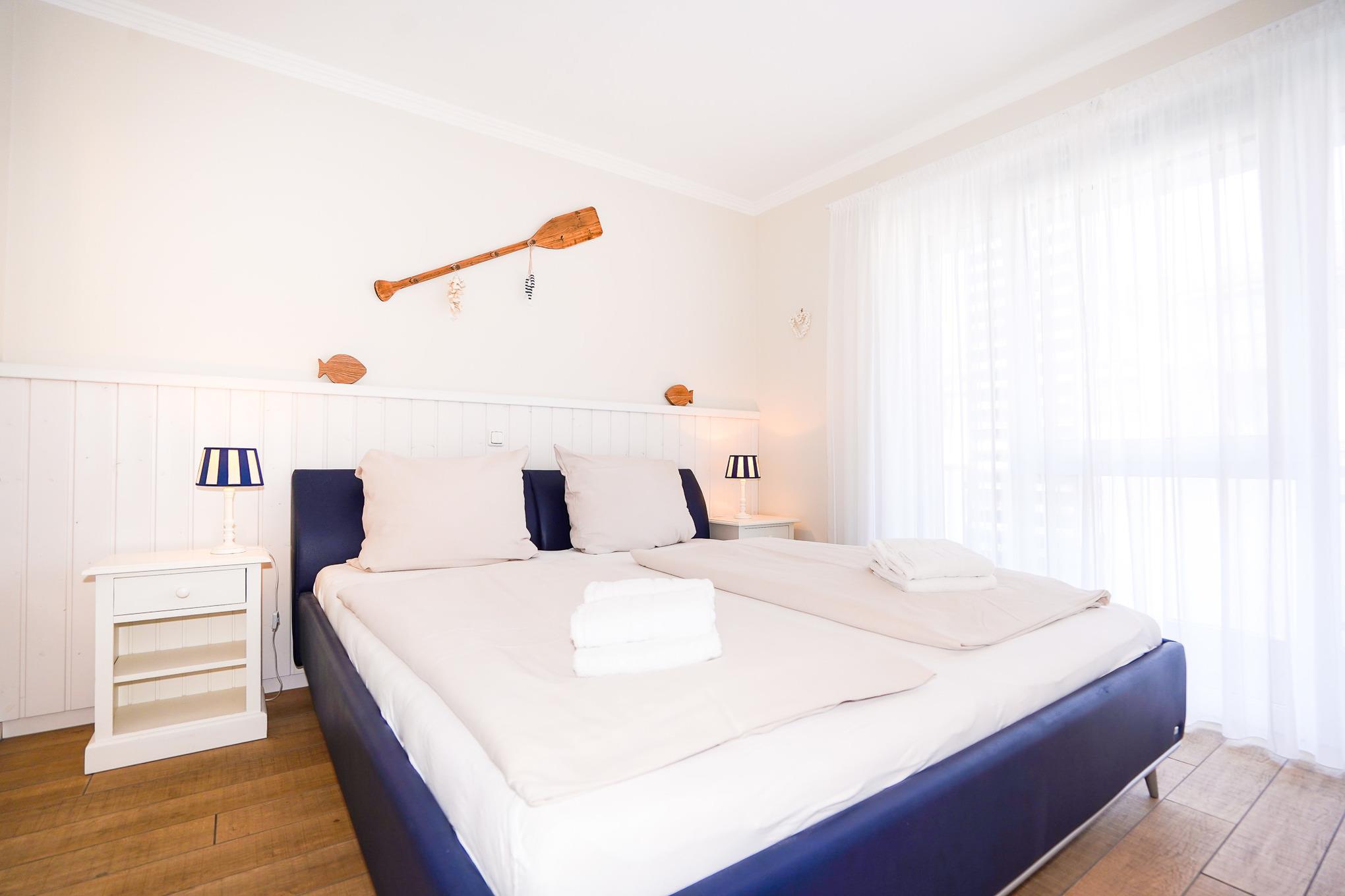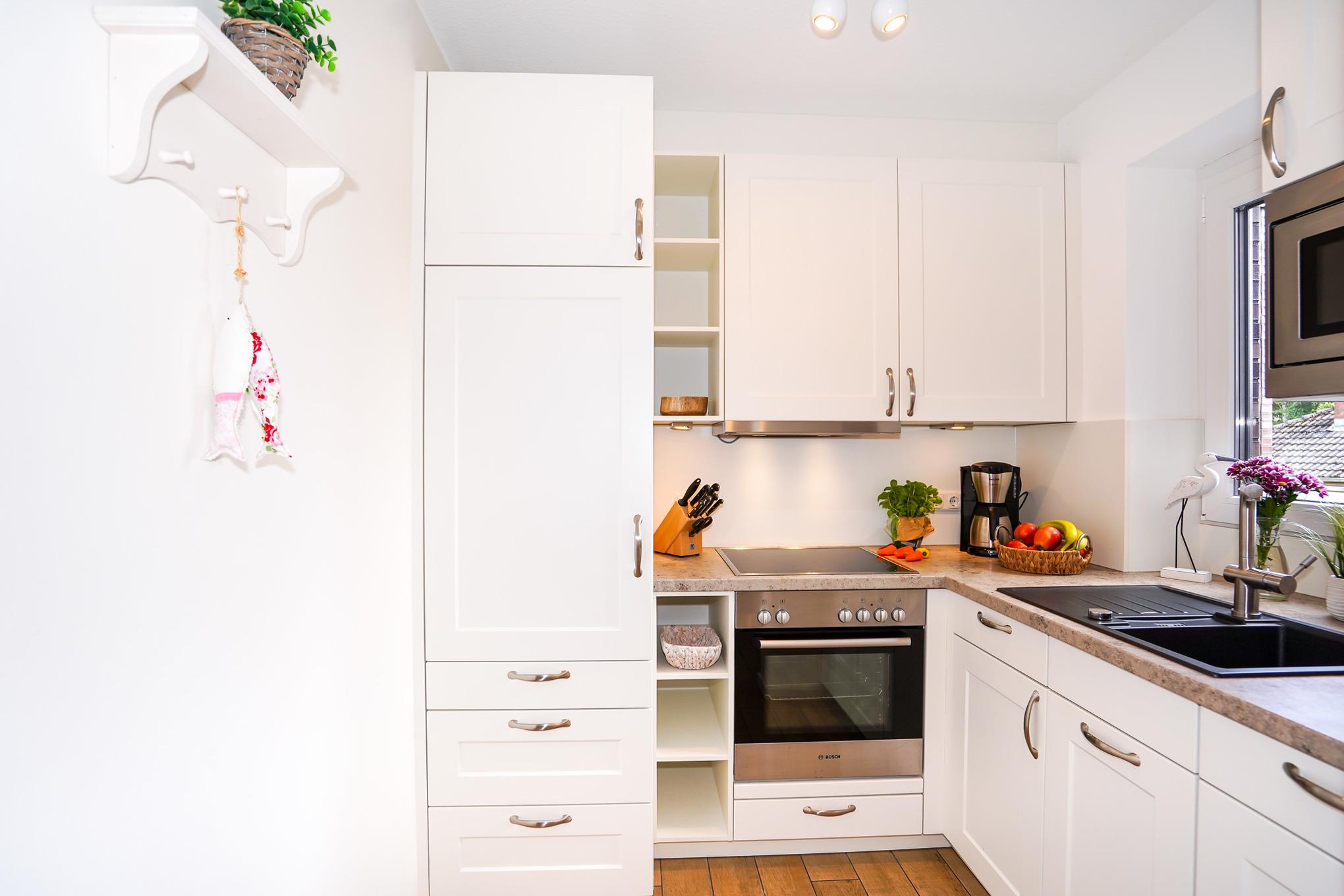 Die Küche lässt keine Wünsche offen. Das Schlafzimmer ist ausgestattet mit einem hochwertigen Doppelbett (180 x 200 cm), weißen Einbaumöbeln und einem zweiten Fernseher.