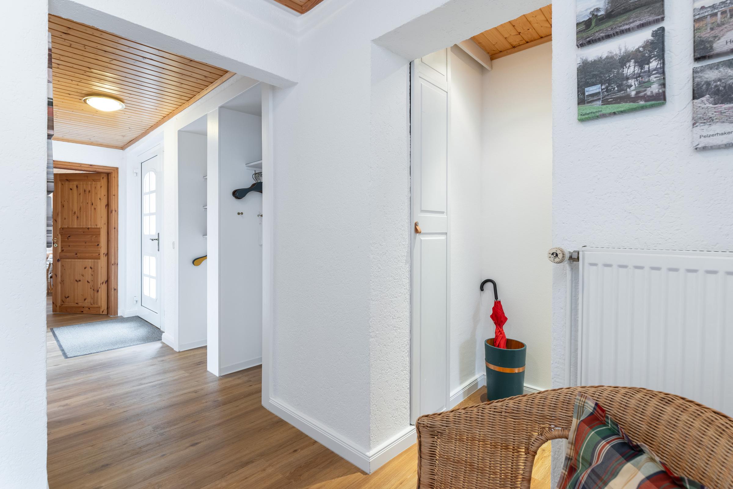 Durch den separaten seitlichen Hauseingang trittst du ein in den Flur mit eingebauter Garderobenecke und -schrank. Vom Flur erreichst du alle 3 Schlafräume und dein Blick fällt in den lichtdurchfluteten Wohnraum mit der großen Fensterfront.
