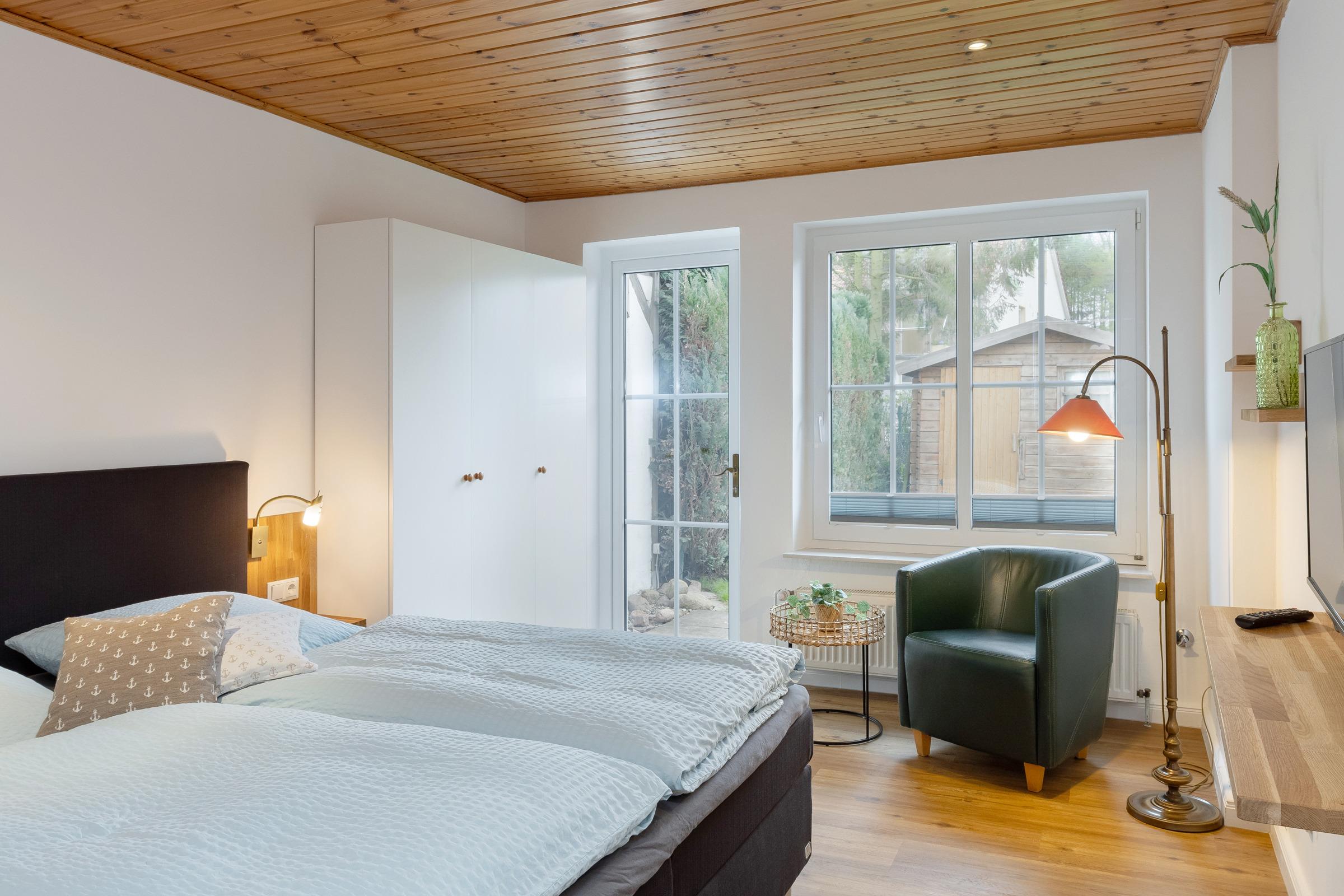Das zweite geräumige Schlafzimmer mit einem komfortablen Boxspringbett (180 x 200 cm) hat Zugang zur eigenen kleinen Terrasse und bietet einen wandmontierten Flachbild-TV sowie einen bequemen Sessel mit Beistelltisch.