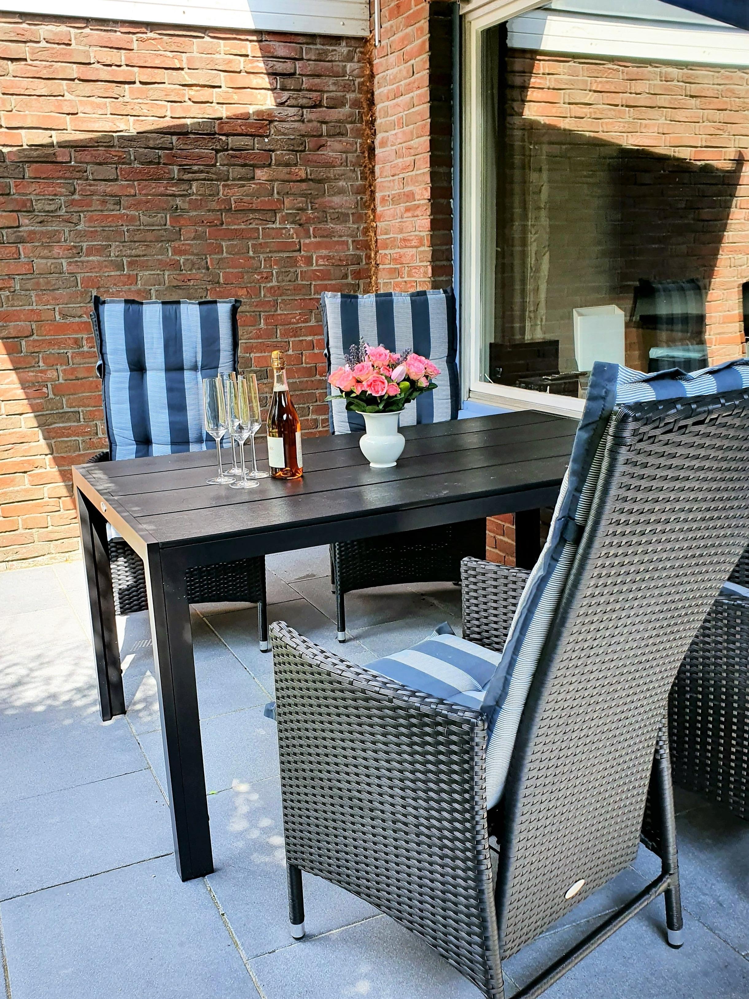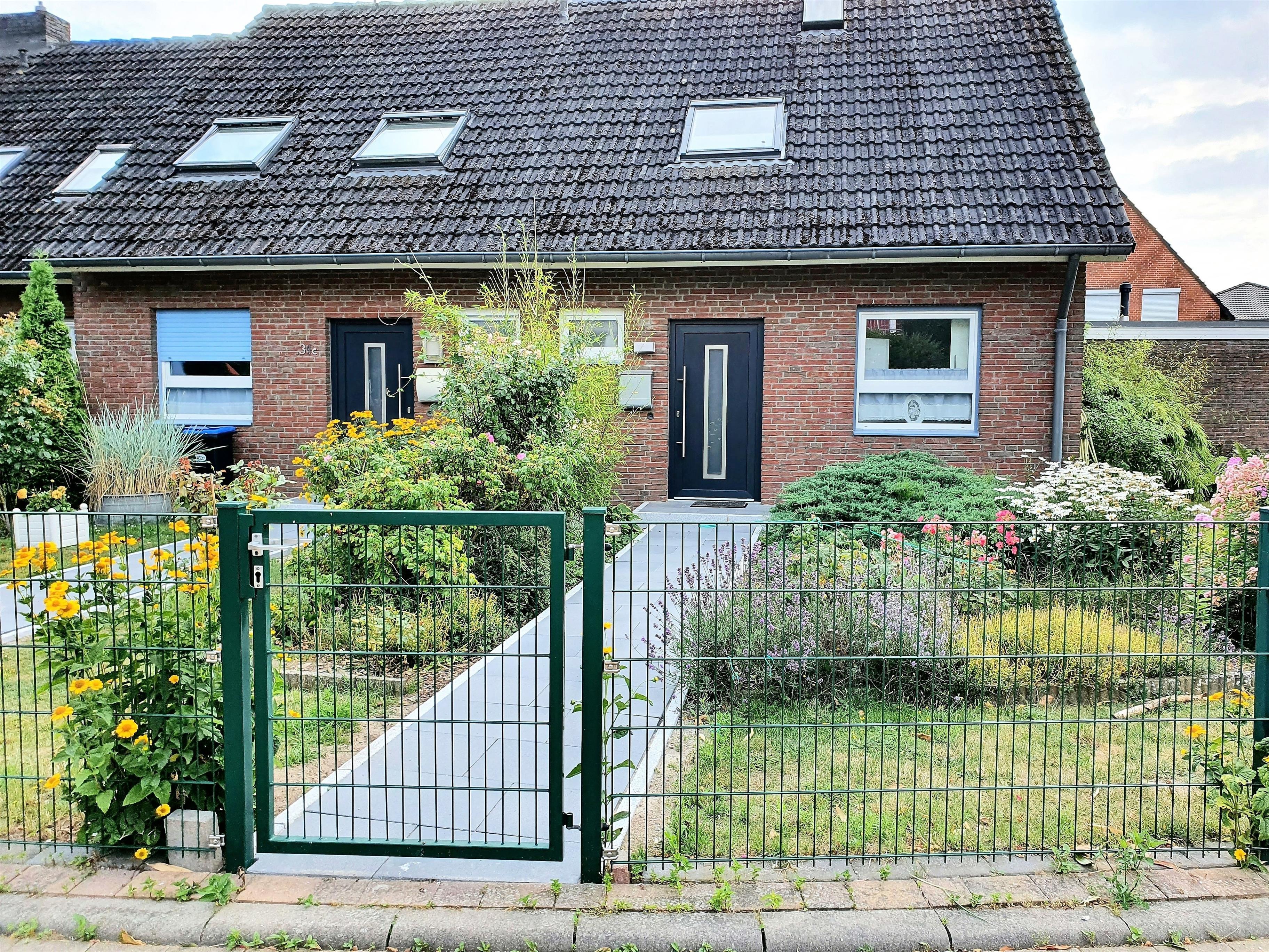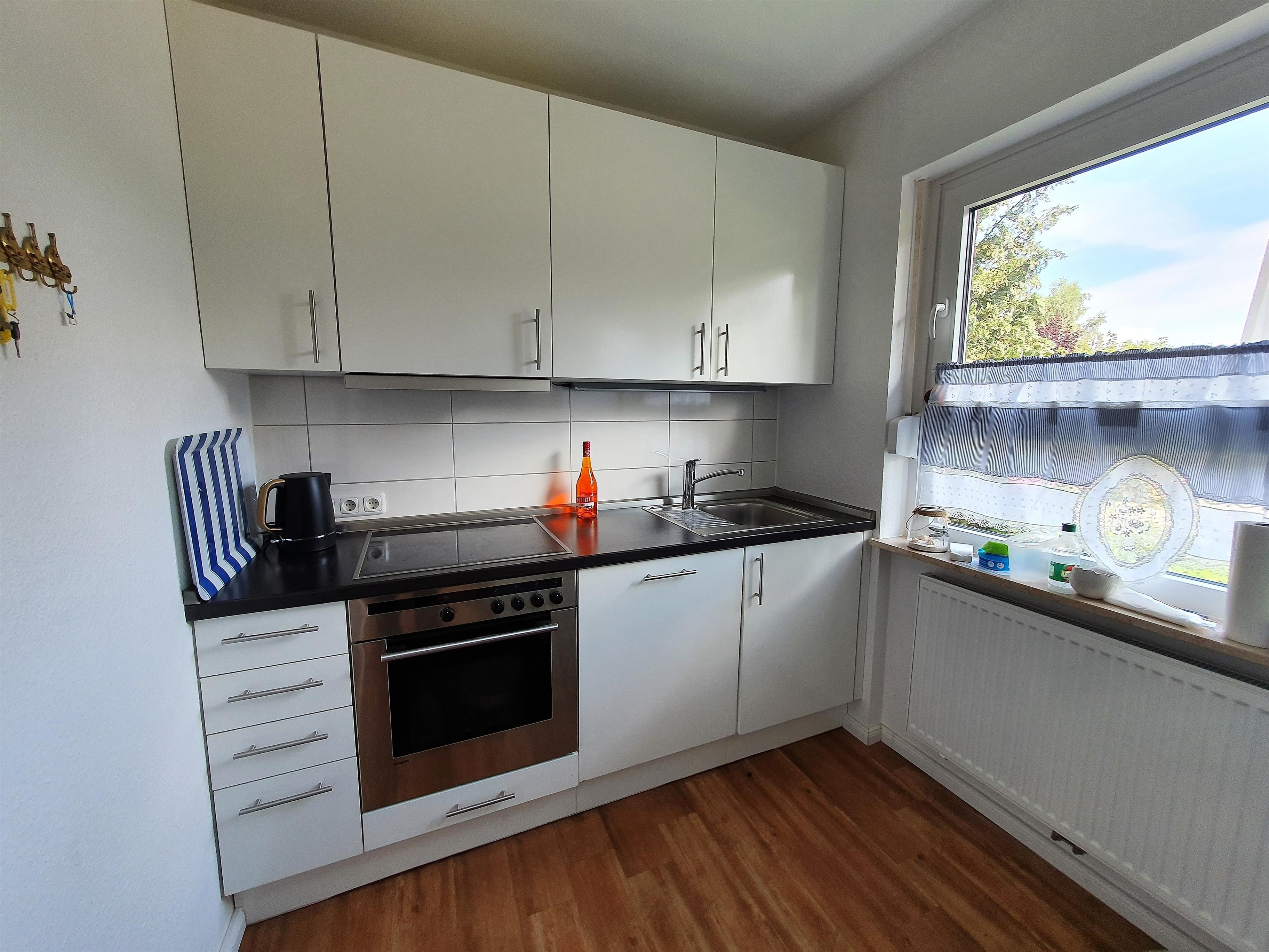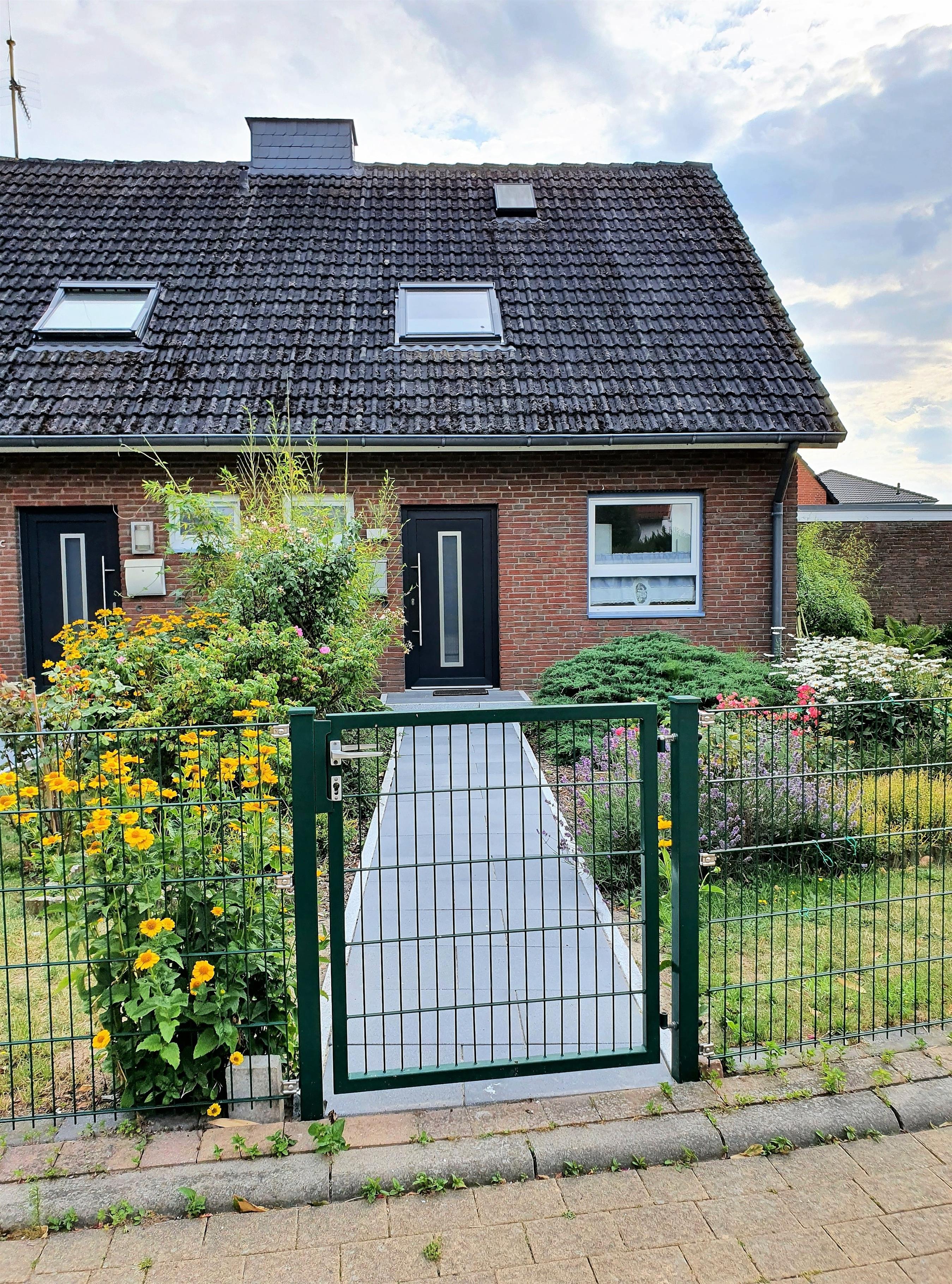 Unsere Doppelhaushälfte befindet sich auf einem eingefriedeten Grundstück. Bei der Hausnummer 31D handelt es sich um ein Endhaus von 2 aneinander gebauten Doppelhäusern. Der zur Strasse gelegene Vorgarten ist umzäunt, zur benachbarten Doppelhaushälfte 31C aber nicht abgetrennt. Das Haus verfügt im Erdgeschoss über Küche, Flur, Gäste-WC und ein Wohn-Esszimmer, im Obergeschoss ein großes und ein kleines Schlafzimmer sowie Bad-WC. Eine Belegung ist mit 3 Personen möglich - zusätzlich kann ein Kleinkind in einem Kinderreisebett untergebracht werden. Virtueller Rundgang: Im Erdgeschoss unseres Hauses befindet sich rechts vom Flur/Treppenhaus die Küche mit modernen Einbaumöbeln, Ceranfeld mit 4 Kochstellen, Dunstabzugshaube, Backofen, Geschirrspüler, Spüle, Kühl-/Gefrierkombination, Mikrowelle, Kaffeemaschine, Wasserkocher, Toaster und einer breiten Auswahl an Küchen-/Kochutensilien sowie Gläsern/Geschirr. Links zwischen Haustür und Treppenaufgang findet sich das kleine Gäste-WC. Wir gehen nun im Flur mit seiner maritimen blau-weißen Streifentapete sowie Abstellmöglichkeiten unter der Treppe geradeaus weiter in das geräume L-förmige Wohn-/Esszimmer. Die Essecke ist mit Weichholzmöbeln ausgestattet. 4 Personen haben hier bequem Platz. Der Tisch ist zusätzlich ausziehbar, eine Weichholzvitrine rundet das ganze Ensemble ab. Den Wohnbereich haben mit einer bequemen 3er-Sitzkombination in schwarzem Leder ausgestattet. Hier kann nicht nur die Rückenlehne nach hinten verstellt, sondern für einen gemütlichen Fernseh-/Filmabend können auch die Beine hochgelegt werden. Über eine Infrarotfernsteuerung werden individuell die vorhandenen Standleuchten für ein gemütliches Ambiente ein- und ausgeschaltet. Der moderne Flachbildfernseher mit einer Diagonale von 140 cm verfügt über Satelliten-TV sowie Smart-TV, so dass über Internet Mediatheken und/oder Netflix angesteuert werden können. Unterhalb des Fernsehers bietet eine Weichholzkommode viel Stauraum und Platz für den vorhandenen DVD-Player. Durch ein Fenster im Essbereich wie das große Panoramafenster im Wohnbereich ist der gesamte Wohnraum lichtdurchflutet und bietet zudem einen schönen Blick auf die Terrasse und ins Grüne. Eine Verdunkelung ist jederzeit durch die Außenrolläden möglich. Rundfunkempfang ist sowohl über TV als auch eine separate Stereoanlage mit CD-Player möglich. Auf der Süd-West-Terrasse finden Sie einen großen Tisch und 4 bequeme Rattan-Stühle mit Sitzauflagen, deren Rückenteile verstellbar sind. Eine 4m breite Markise sorgt für die ggfls notwendige Beschattung. Der kleine Garten ist rundherum eingezäunt. Ein kleiner Efeu-berangter Pavillon lädt zum Genuß der Morgensonne ein.