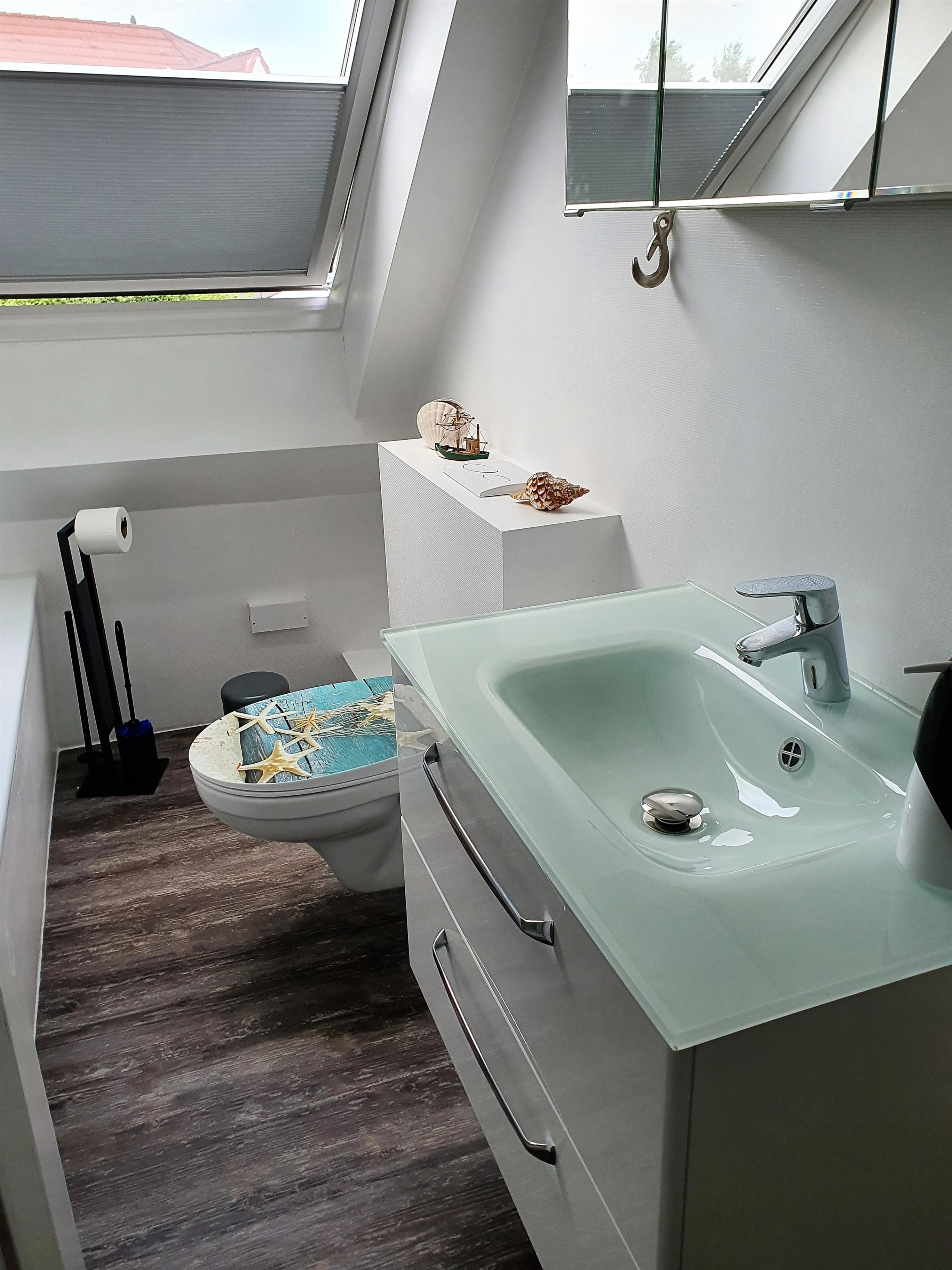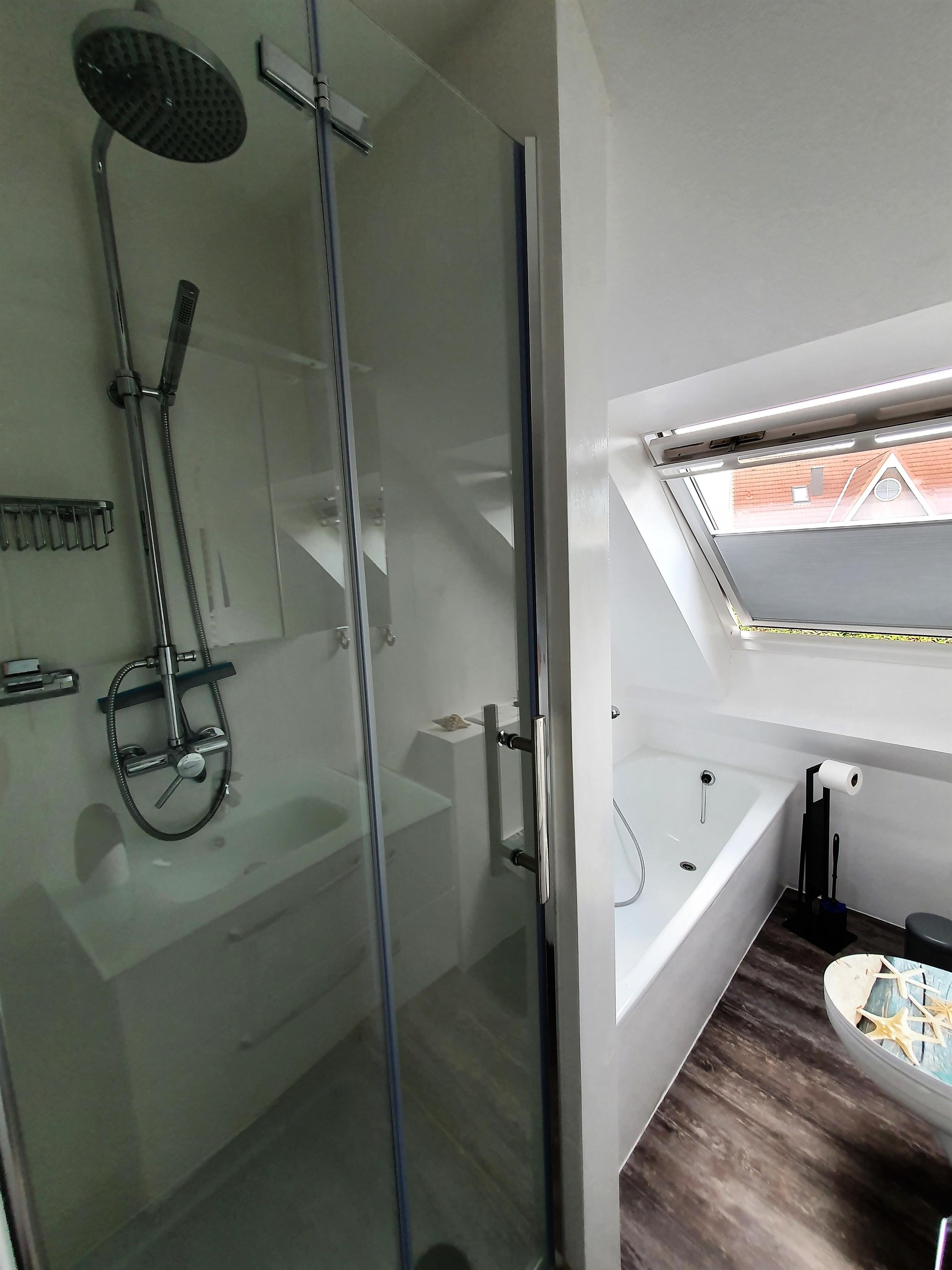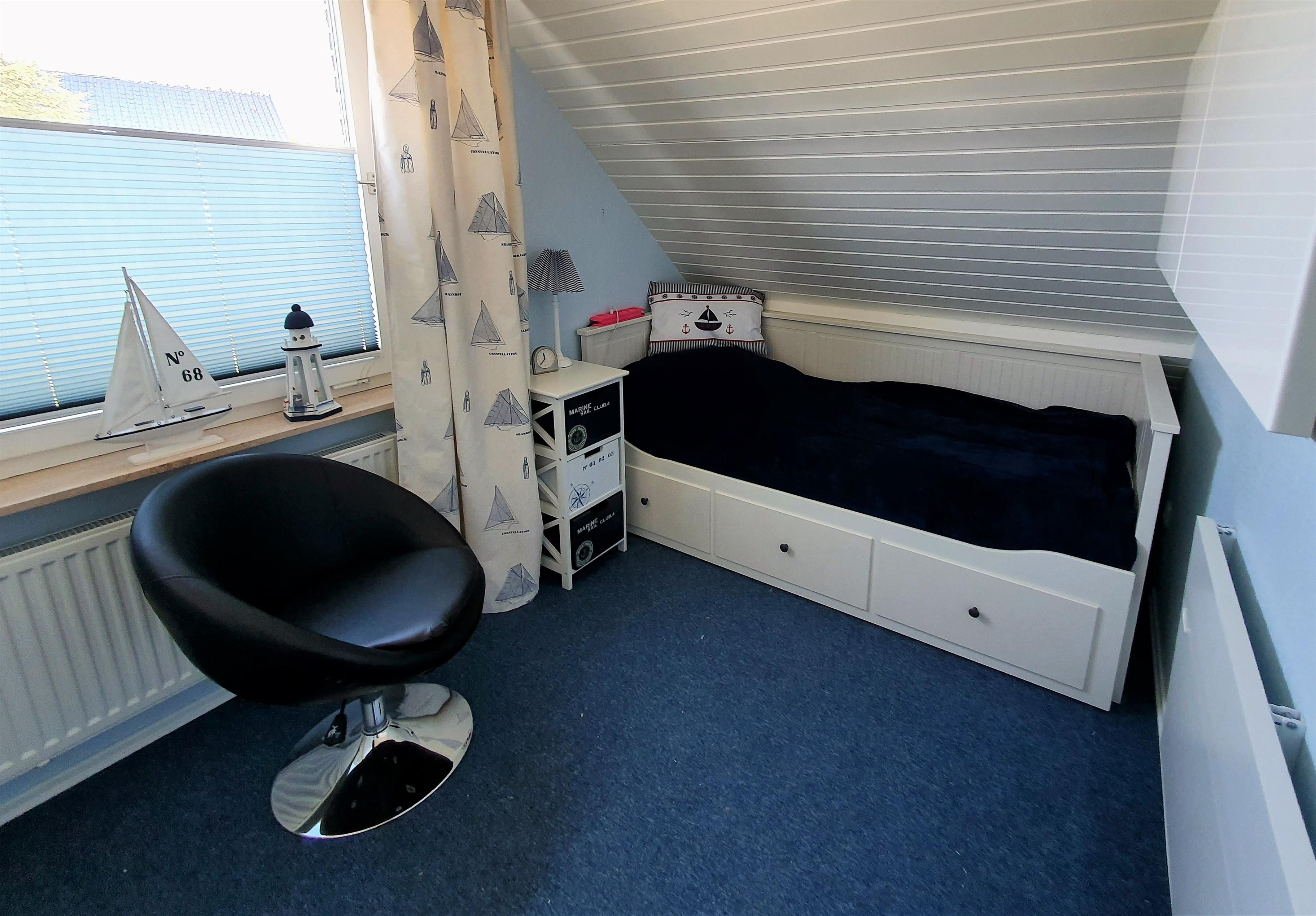 Im Obergeschoß unseres Hauses finden Sie das geräumige Schlafzimmer mit Doppelbett 180x200 (Einzelmatratzen je 90x200), Weichholzkleiderschrank, Kommode, 2 Stühlen und Bettschubladen. Verdunkelung auch hier über die Außenrolläden. Das kleine Kinderzimmer ist mit einem Kajütbett 80x200 cm ausgestattet, 3 Kleiderschränke mit je 50 cm Breite und einem bequemen Ledersessel. Auch hier kann über den Außenrolladen perfekt verdunkelt werden. Das Bad verfügt über eine Badewanne, Toilette, Waschtisch mit 2 Schubladen, Spiegelschrank und ein Duschbad 80x80 cm. Hinweis: Eine Dusche dieser Größe ist für sehr beleibte oder Menschen mit Handicap u.U. nur bedingt geeignet. Das große Veluxfenster bietet Sonnen- und Sichtschutz.