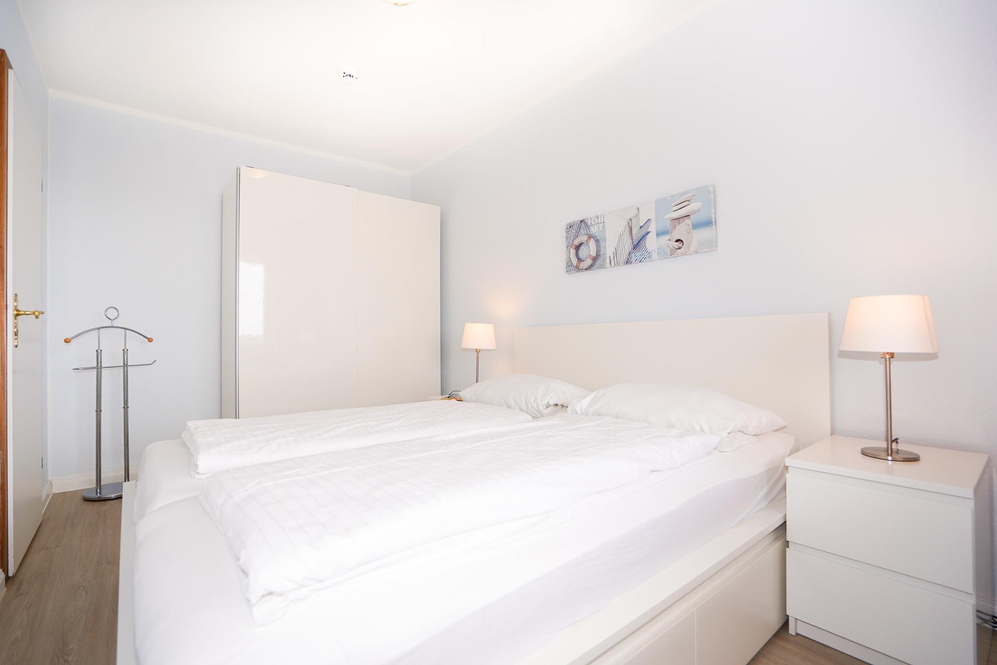 Das freundliche Schlafzimmer ist mit einem Doppelbett und einem Kleiderschrank ausgestattet. Einbauschränke im Flurbereich bieten weiteren Stauraum. Im Badezimmer finden Sie eine Dusche, WC, Waschbecken und Handtuchheizkörper vor.