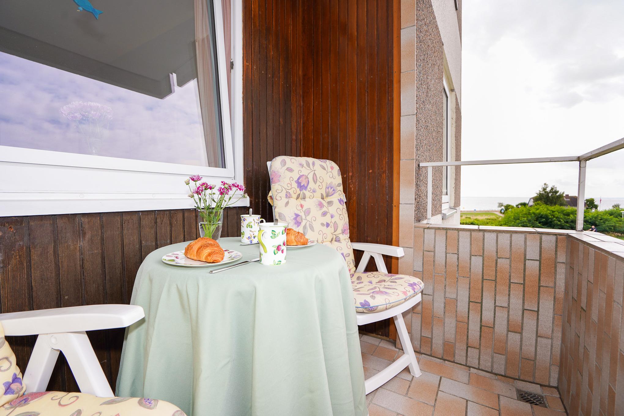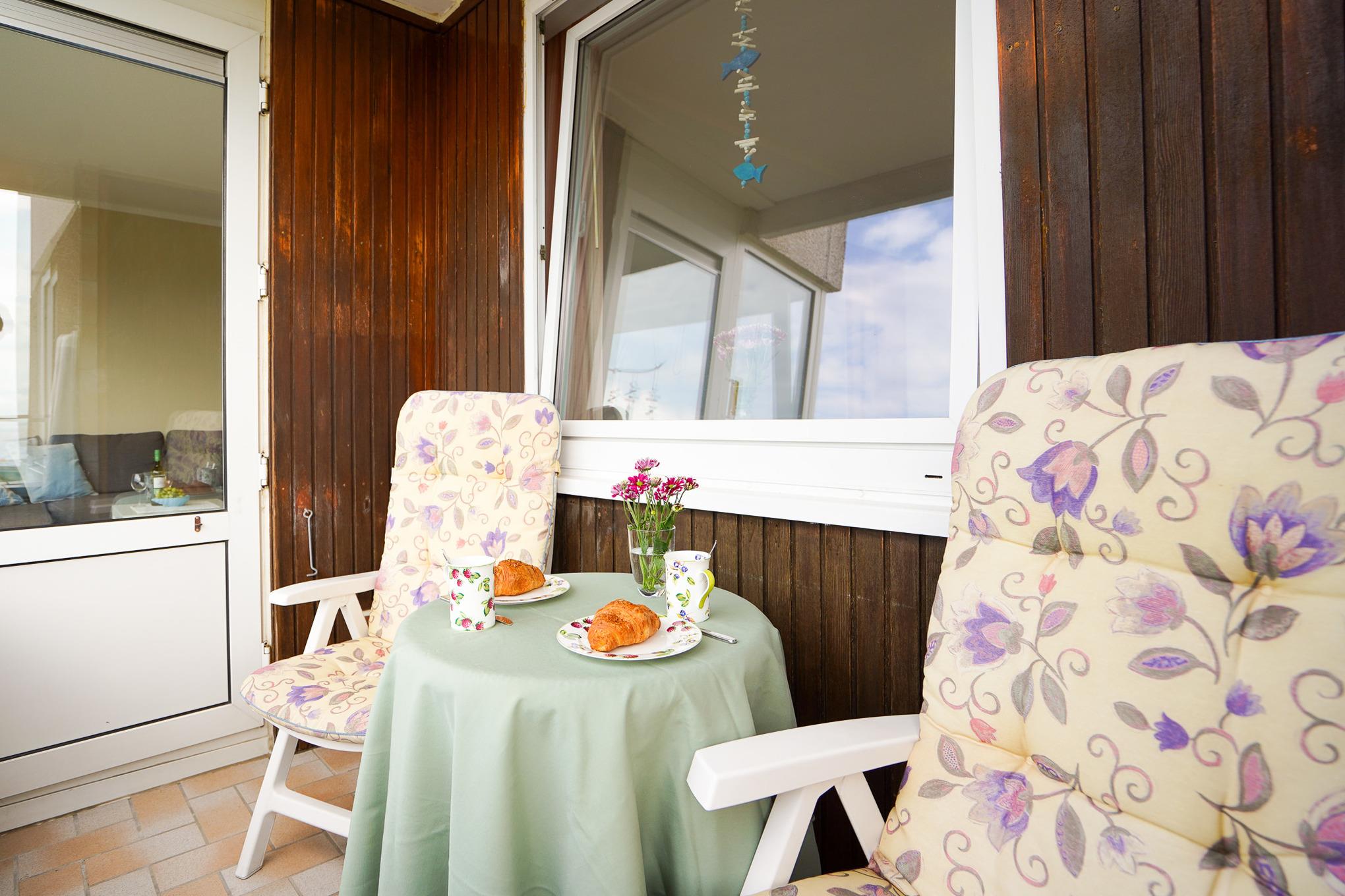 Helle 2-Zimmer-Ferienwohnung in Grömitz mit Meerblick und Balkon, ideal für einen erholsamen Strandurlaub.