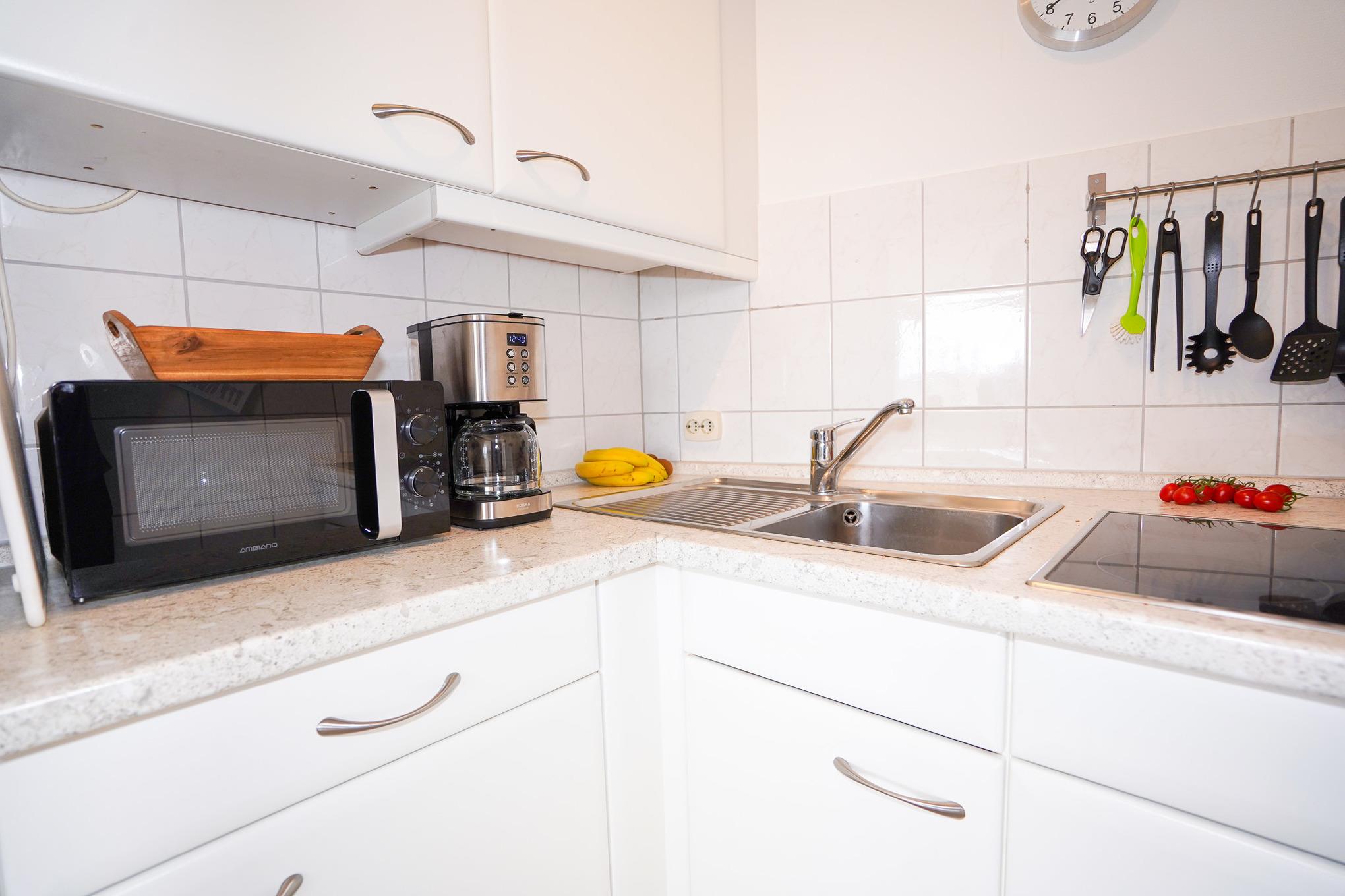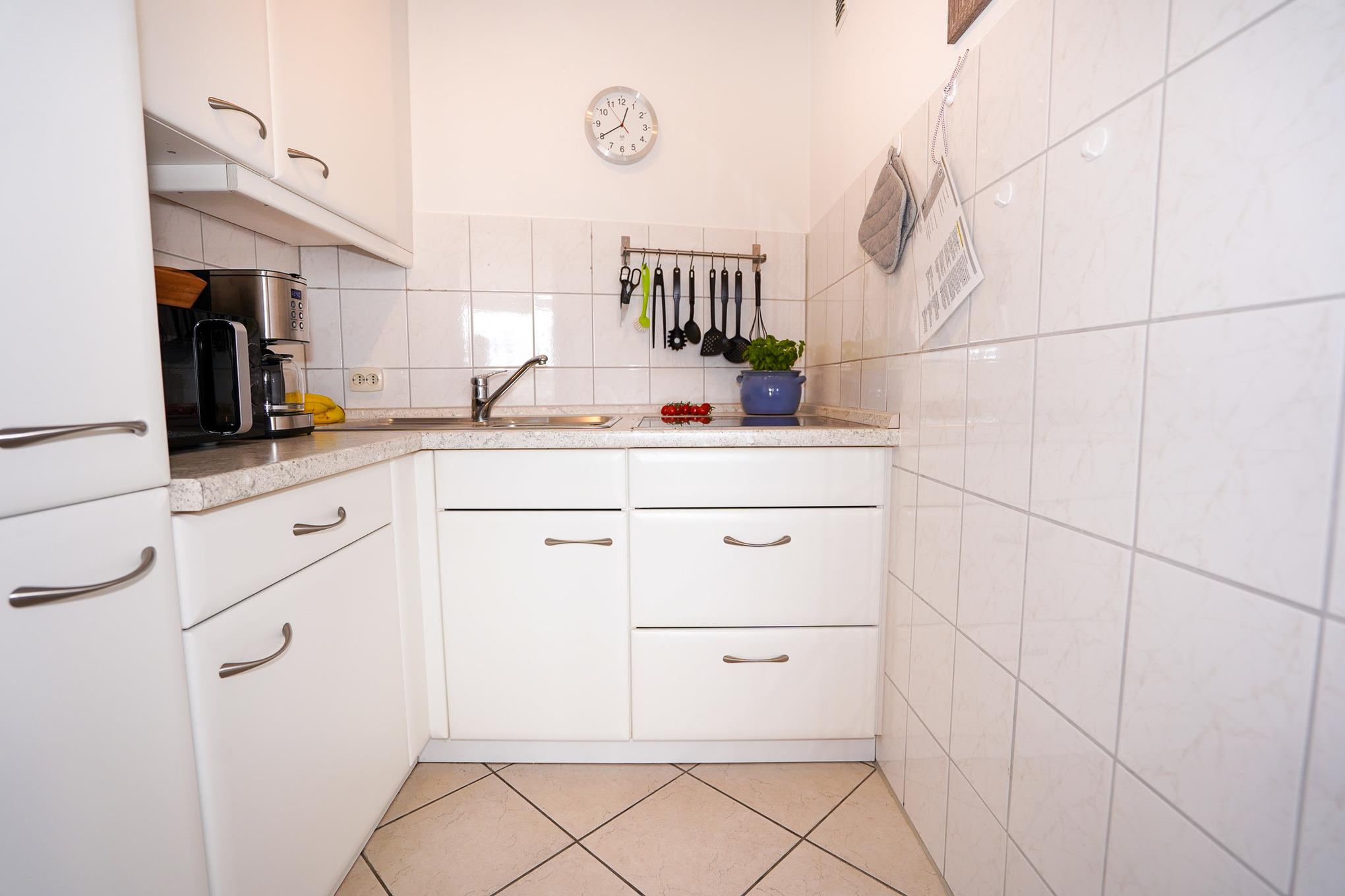 Die helle Küche bietet Ihnen ein Cerankochfeld, Kühlschrank und diverse kleine Küchenutensilien wie Kaffeemaschine, Wasserkocher und Toaster.