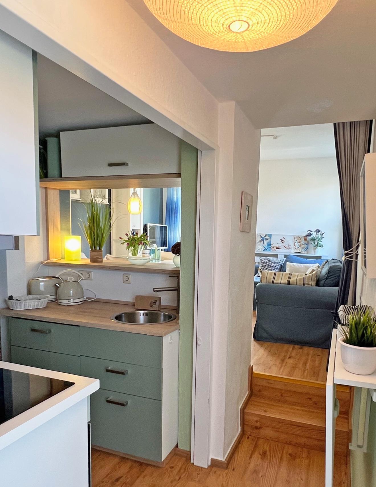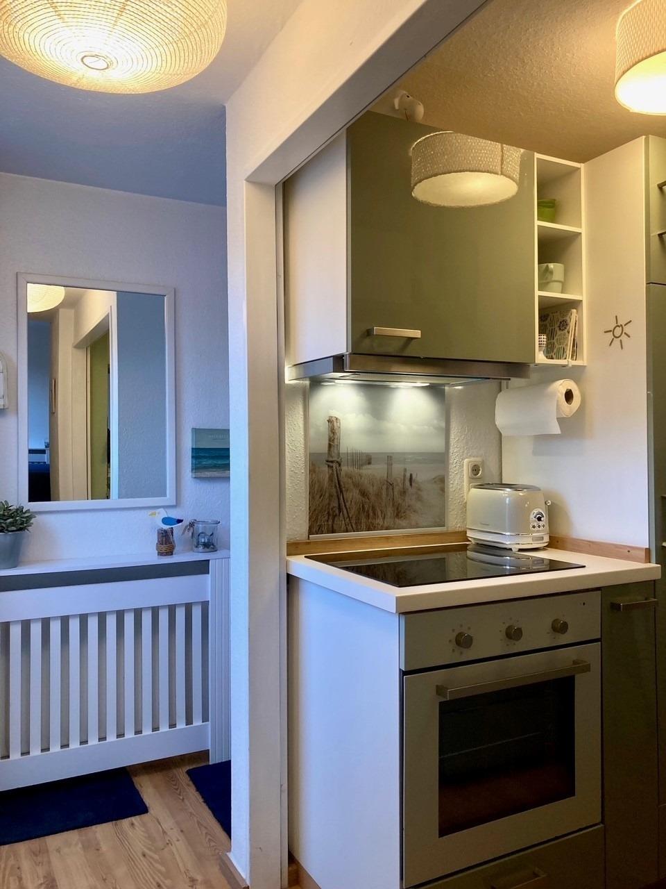 Die offene Küchenzeile ist modern und bestens ausgestattet: Kaffeemaschine, Induktionsherd, Backofen, Geschirrspüler sowie ein Kühlschrank mit Gefrierfach, Mikrowelle, Mixer und viele weitere Annehmlichkeiten stehen Ihnen zur Verfügung, damit Sie auch kochen können.
