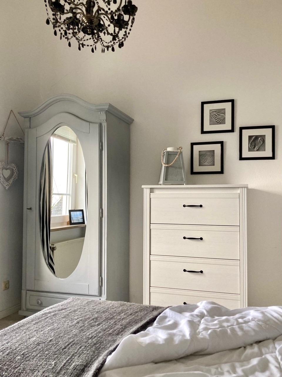 Die nächste Split-Level-Wohnebene im Dachgeschoss bietet das liebevoll gestaltete Schlafzimmer. Perfekt für Ihre erholsamen Nächte mit Distanz zum Wohn-Schlafzimmer im Erdgeschoss. Es erwartet Sie ein ruhiger, gemütlicher Rückzugsort zur Parkplatzseite. Hier schlafen Sie in dem gemütlichen Doppelbett (1,80 x 2 m mit zwei Matratzen), vorhanden sind ein Kleiderschrank, eine Kommode und ein Schreibtischplatz, der auch gerne als Schminktisch genutzt wird.