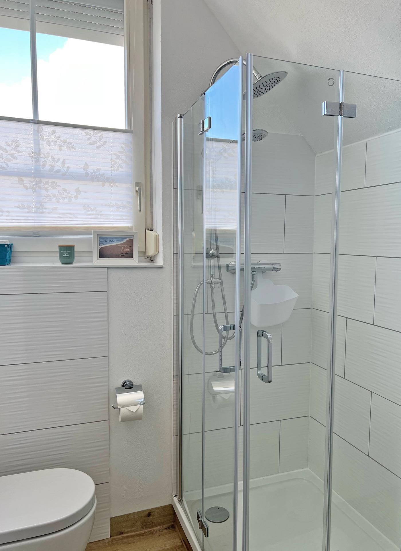 Im ersten Stock befindet sich das freundlich helle und moderne Tageslichtbadezimmer – mit Dusche, WC und Platz für Ihre Wäsche.