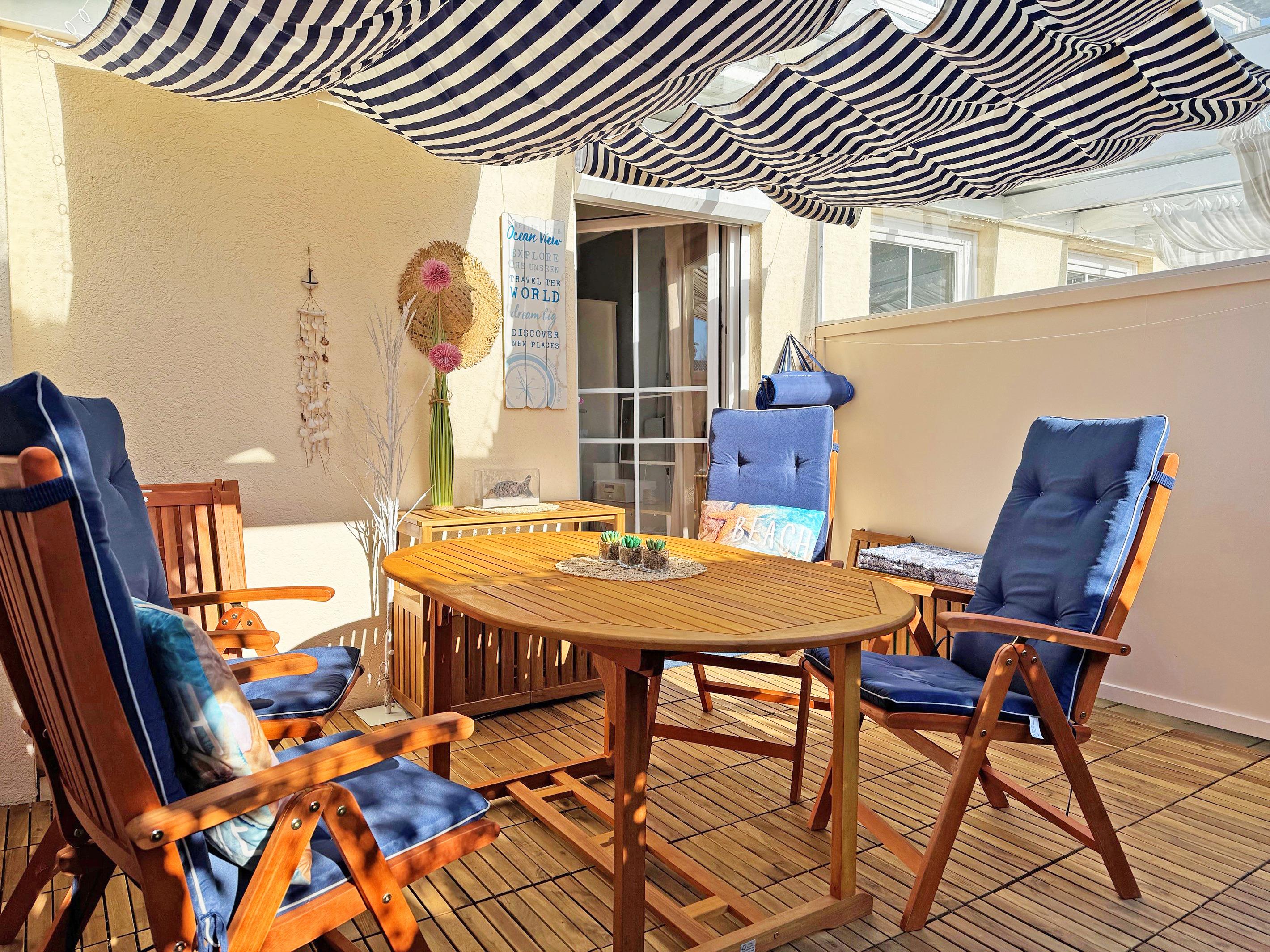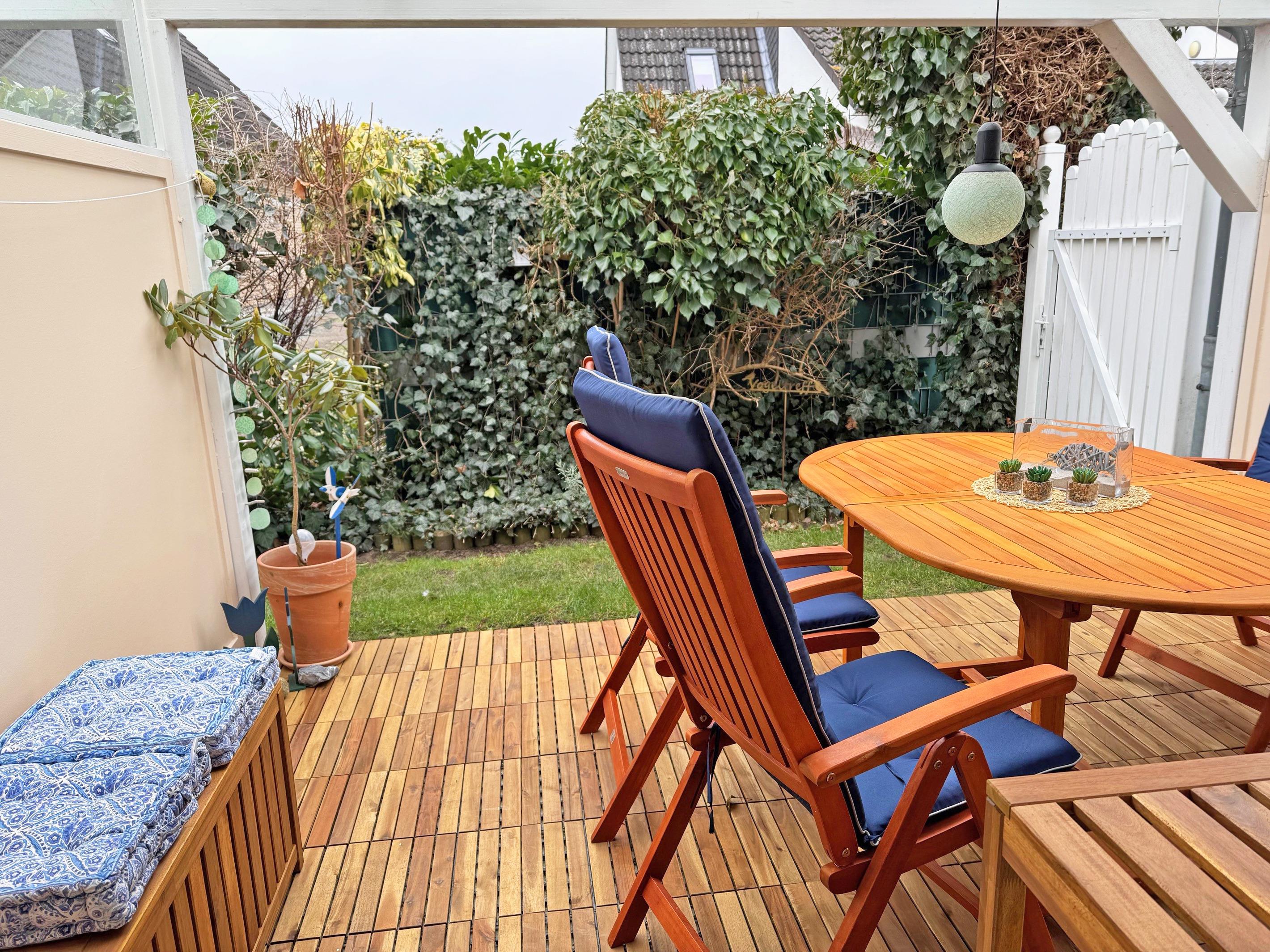Vom Wohnzimmer aus gelangen Sie auf die überdachte Terrasse – Ihr zweites Wohnzimmer unter freiem Himmel. Wind- und sichtgeschützt, mit Hochlehner-Gartenstühlen, Sonnensegel und ausziehbarem Esstisch sowie Abstellmöglichkeiten und einer Strandbox ausgestattet, können Sie hier zu jeder Jahreszeit entspannte Stunden verbringen. Ein schmaler Rasenstreifen schließt sich an – ideal für eine kleine Verschnaufpause an der frischen Luft. Grillen ist hier auf einem Elektrogrill erlaubt, den Sie bitte selbst mitbringen, wenn gewünscht.