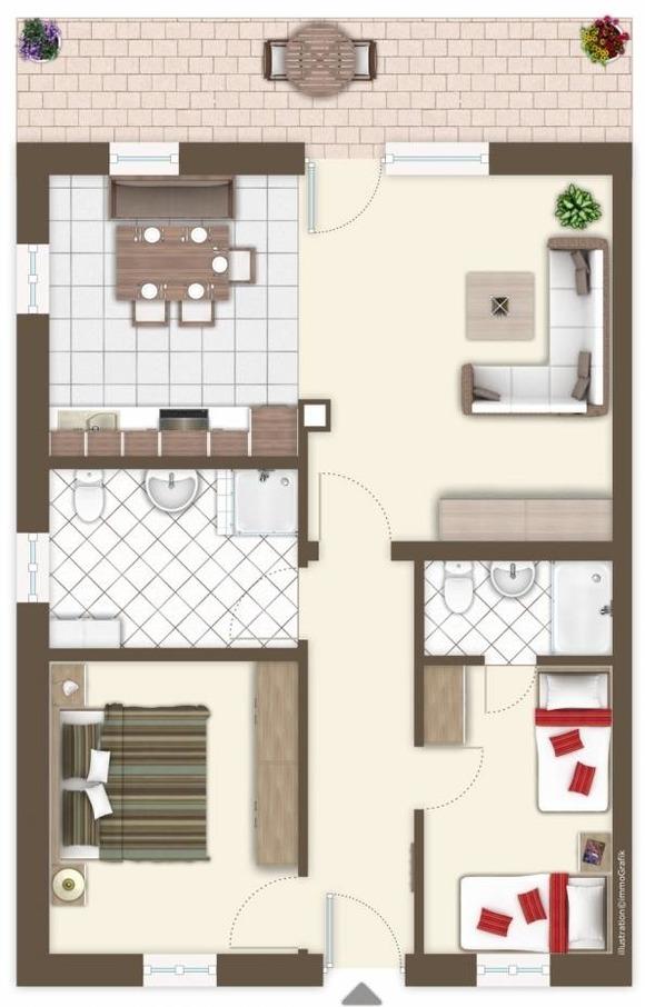 Die Wohnung ist ca. 60 qm groß und ausgelegt für 2-4 Personen. Sie besteht aus einem offenen Wohnzimmer mit Essbereich, Küche, 2 Schlafzimmern und 2 Duschbädern.