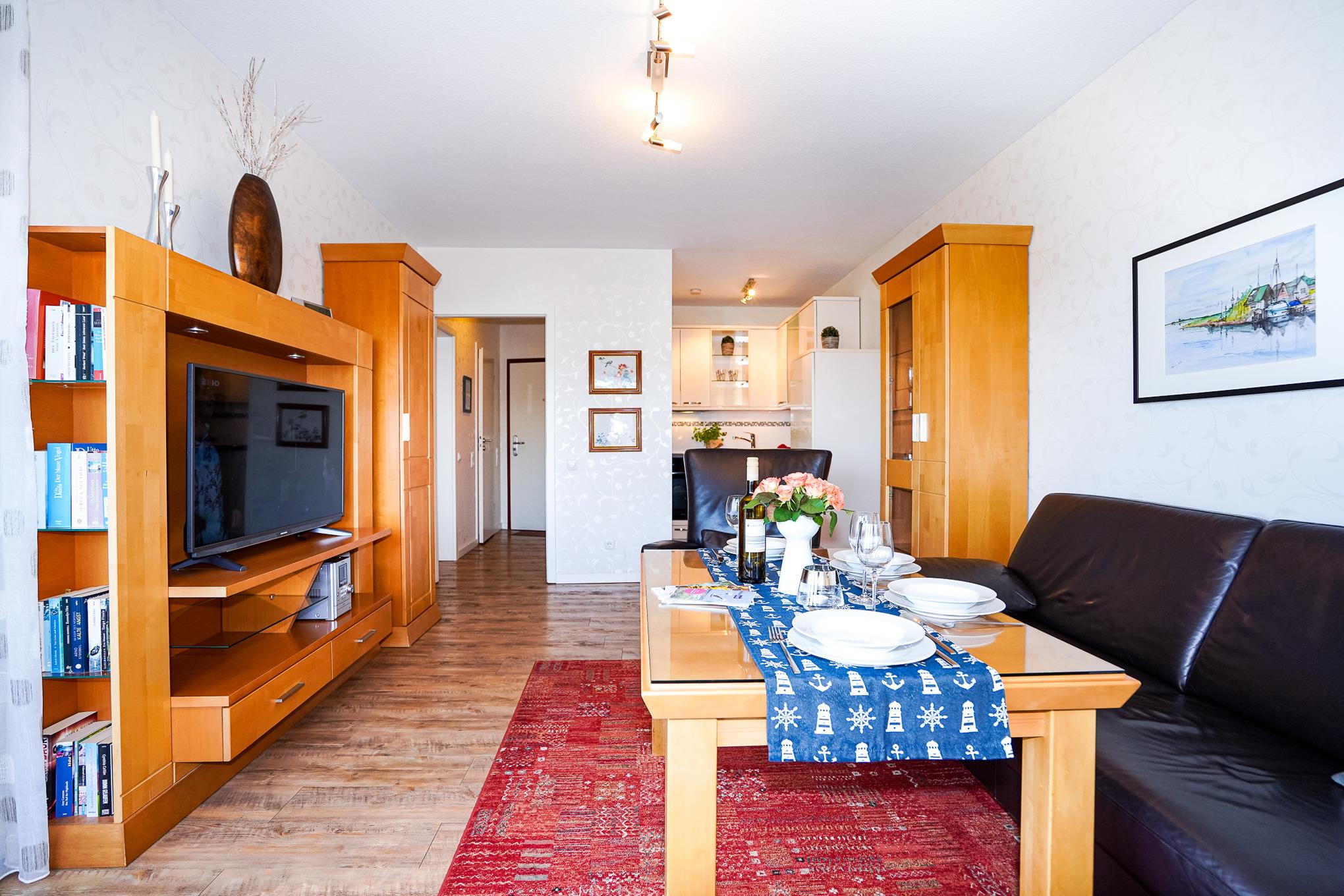 Die Ferienwohnung befindet sich im 6. Stock der bekannten Hausanlage "Hanseat I", welche in sehr ruhiger Lage, direkt hinter dem Deich liegt. Die weitläufige Promenade mit ihren vielen Geschäften und Restaurants lädt zum Bummeln ein. Bitte berücksichtigen Sie, dass der Aufzug nur bis zur 5. Etage reicht.