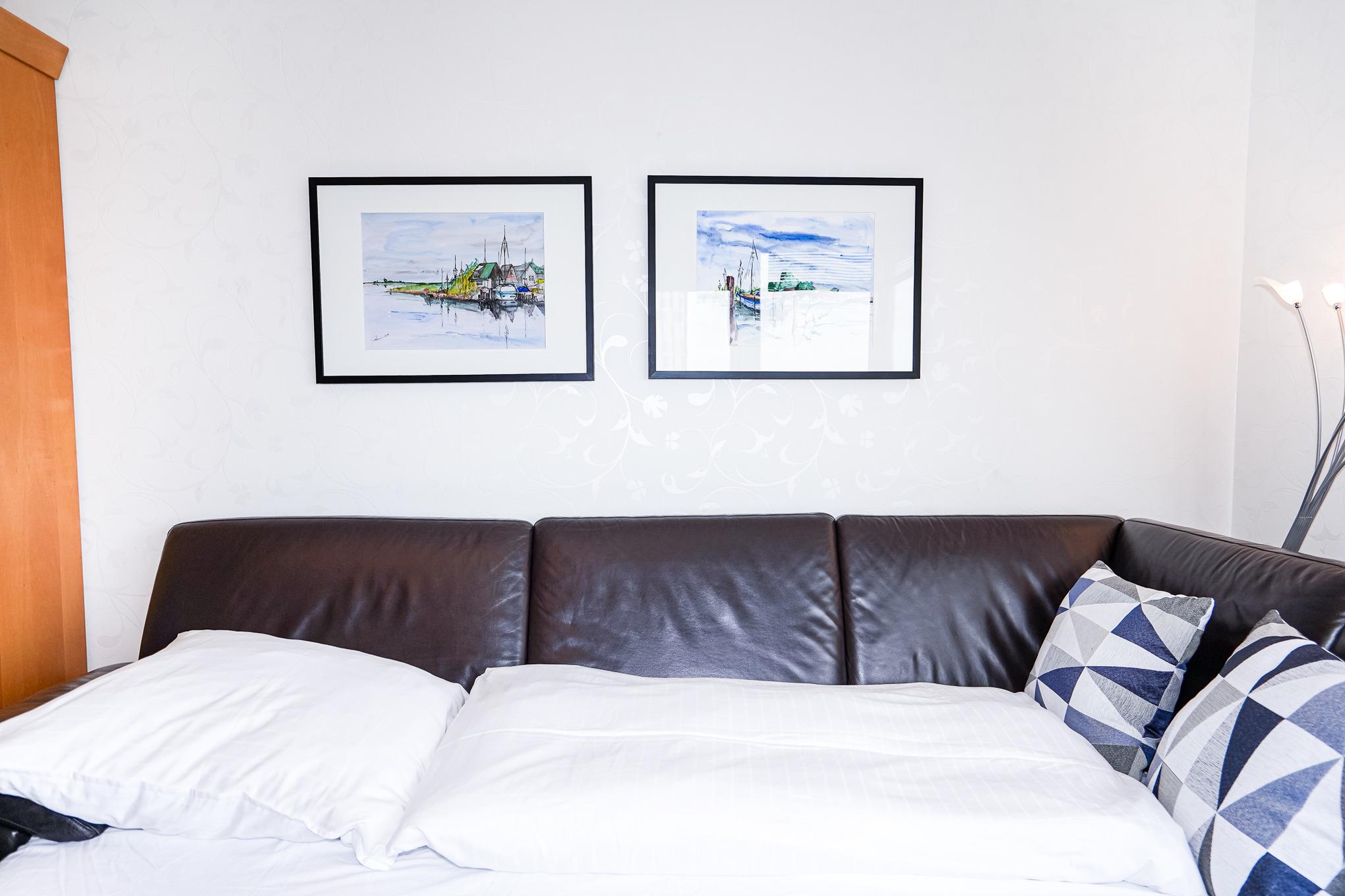 Im Schlafzimmer finden Sie ein großes und bequemes Doppelbett (180 x 200cm), einen Schrank und ein Schlafsofa (90 x 200cm) vor. Im Flur steht Ihnen ein weiterer großzügiger Schrank für Ihre Urlaubsgarderobe zur Verfügung. Das sehr hochwertige Badezimmer mit Dusche zeichnet sich durch sein angenehmes Lichtkonzept aus.