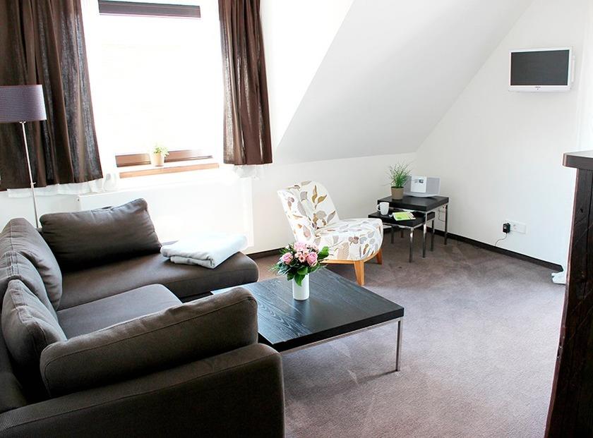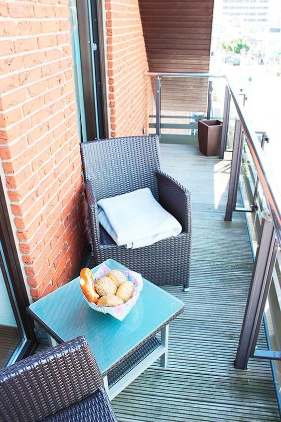Ausstattung: ca. 35 m² Schlafzimmer mit Doppelbett, Bad mit Regenkopfdusche und WC, Balkon mit Sitzmöbeln, voll ausgestattete Pantryküche mit 2 Herdplatten, Esstheke mit Sitzgelegenheiten, kostenloses W-LAN, Flat-TV, Waschmaschinen- und Trocknernutzung (gegen Gebühr).