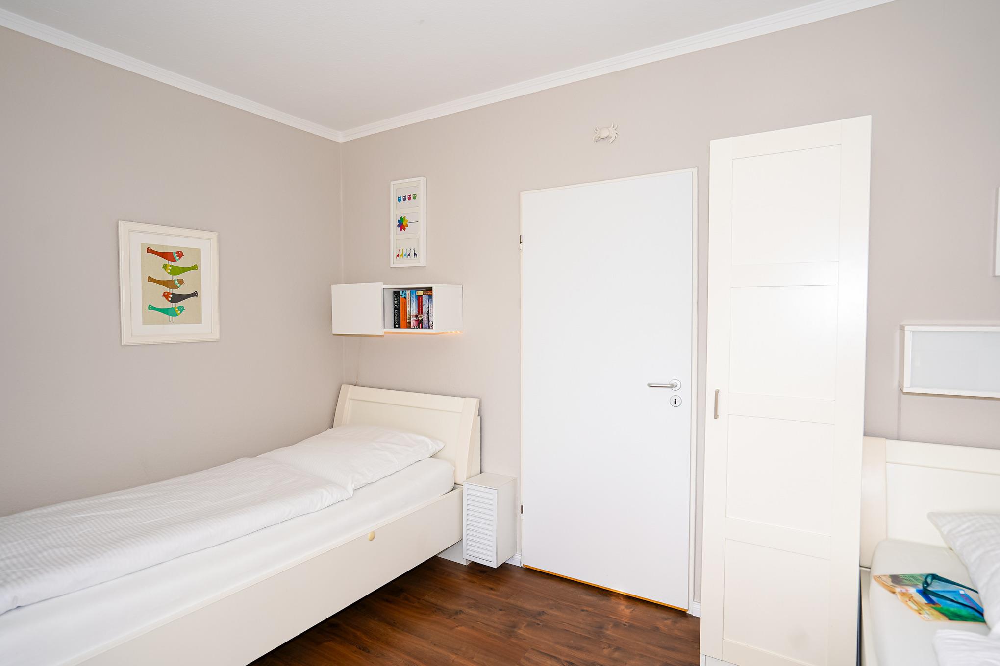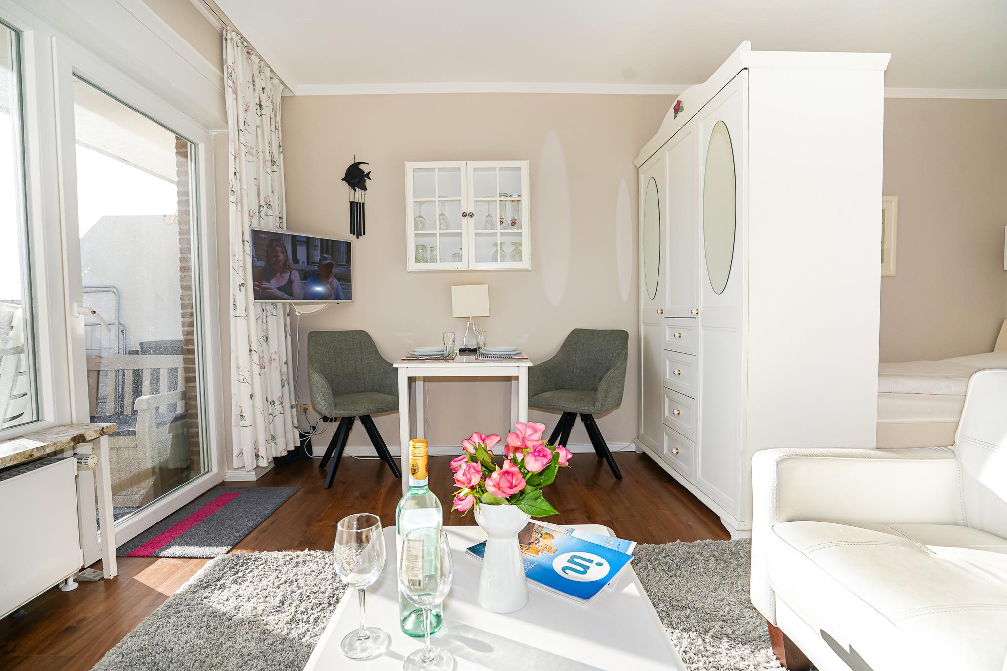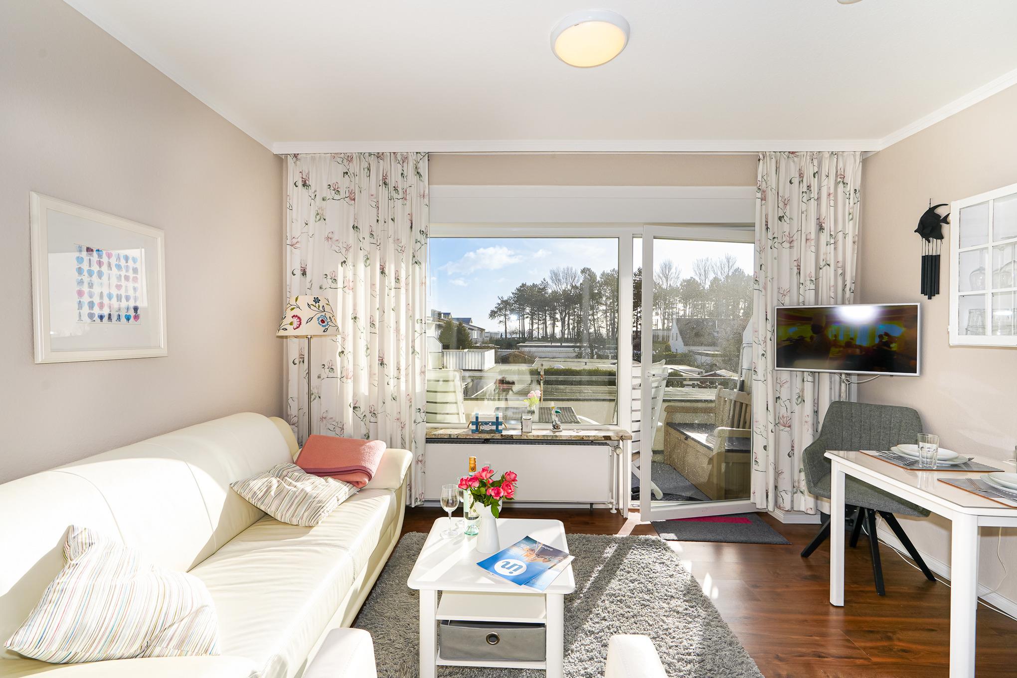 Der lichtdurchflutete Wohnraum wurde mit einem neuen Designer-Vinylboden ausgelegt und teilt sich optisch in zwei Bereiche auf. Ein geräumiger Kleiderschrank und ein Regal mit allerlei Stauraum trennen den Wohnbereich mit kuscheliger Sofaecke, Flat-Screen-TV und einem kleinen Esstisch für 2 Personen vom Schlafbereich. Hier ist auch der Zugang zum lauschigen Balkon. Ein Strandkorb sowie weitere Sitzmöglichkeiten bieten den ganzen Tag über einen sonnigen Blick in Richtung Ostsee.