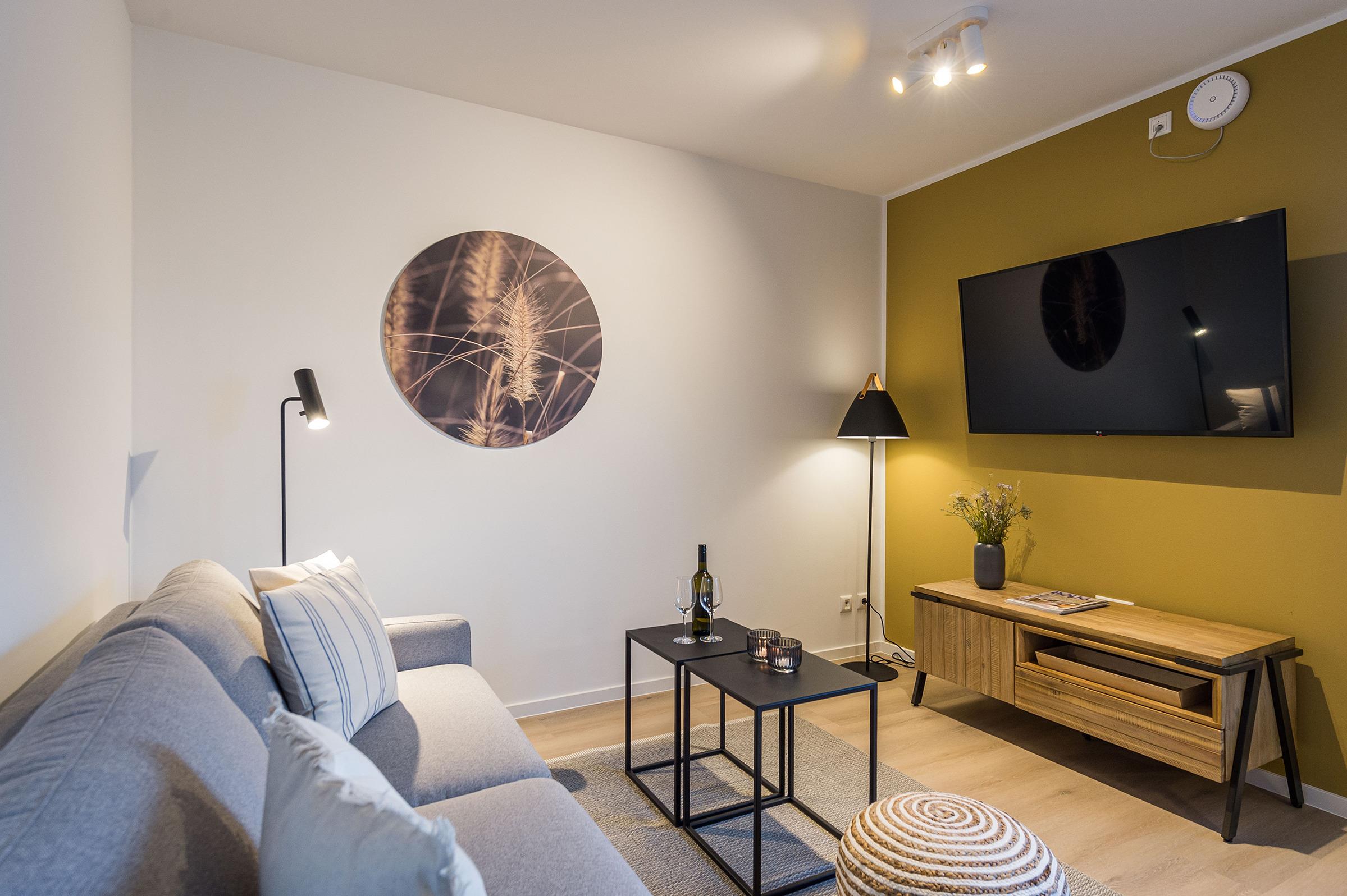 eine Mikrowelle sowie einen Waschtrockner. Im Wohnbereich erwartet Sie ein 55-Zoll-Smart-TV sowie der Zugang zum Balkon. Der Balkon ist ebenfalls mit einem Esstisch ausgestattet und bietet einen herrlichen Blick auf die Ostsee. Selbstverständlich bieten wir schnelles und kostenfreies WLAN sowie einen PKW-Stellplatz direkt am Haus. Auf den hauseigenen Parkplätzen stehen Ihnen E-Auto-Ladegeräte (Wallboxen) zur Verfügung (gegen Gebühr). Aufgrund der Allergiker gerechten Ausstattung sind Haustiere nicht erlaubt.