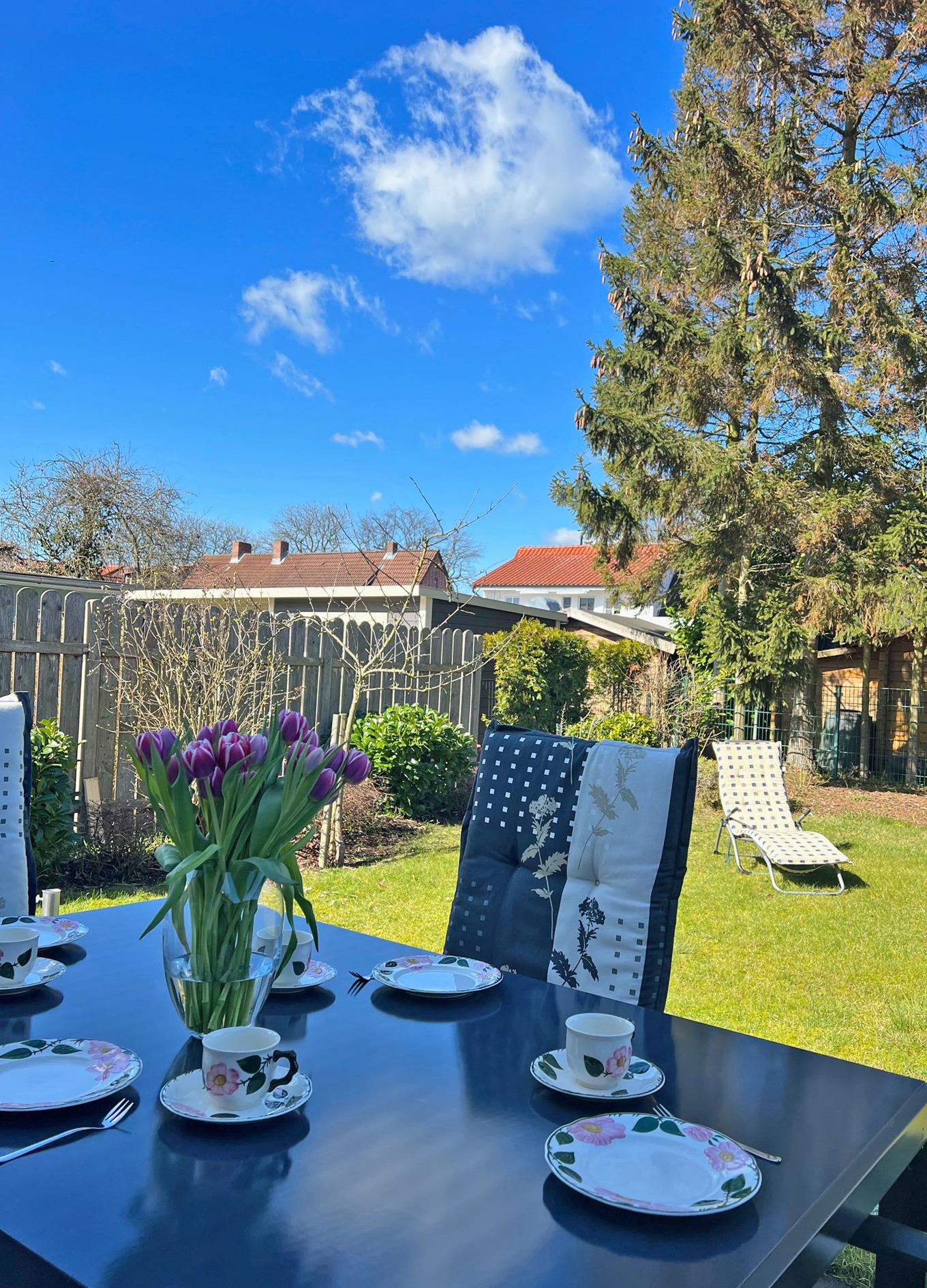 Eigener PKW-Stellplatz vor dem Haus, große, schöne Terrasse, Rasenfläche. Waschmaschine und Trockner im Haus (gegen Gebühr), Fahrradraum im Keller.