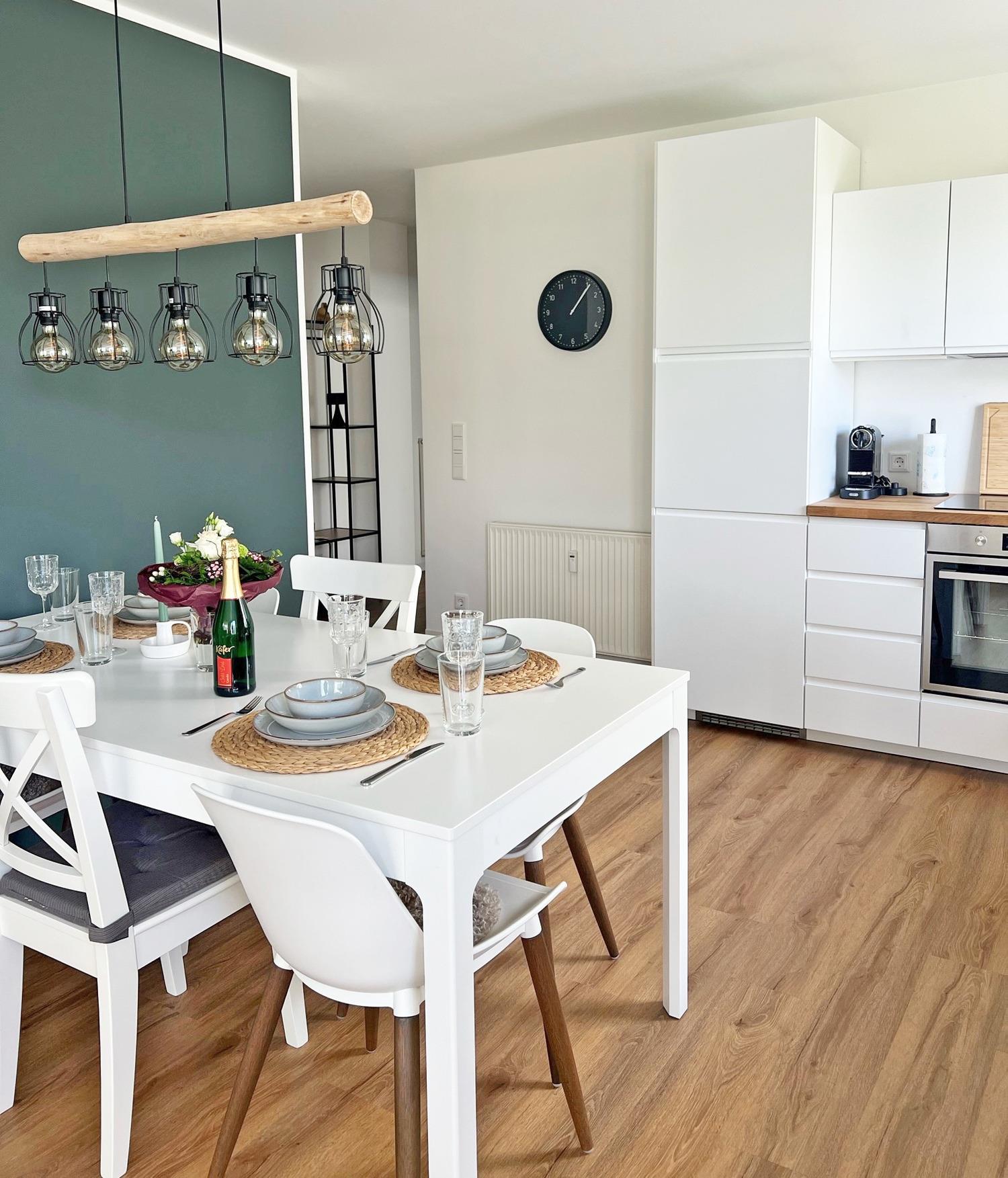 Die Wohnung bietet Ihnen ein geräumiges Wohn- und Esszimmer mit zwei Terrassenzugängen in West- Richtung. Der Wohnbereich ist mit einem Ecksofa und einem Flachbildschirm ausgestattet. Eine komplett ausgestattete, zum Wohn-Essbereich hin offene Küche bietet Ihnen u.a. einen 4-Platten E-Herd mit Cerankochfeld, Backofen, Kühlschrank, Spülmaschine, Mikrowelle, Kaffeemaschine, Wasserkocher und Toaster. Der Esstisch bietet Platz für 4 Personen.